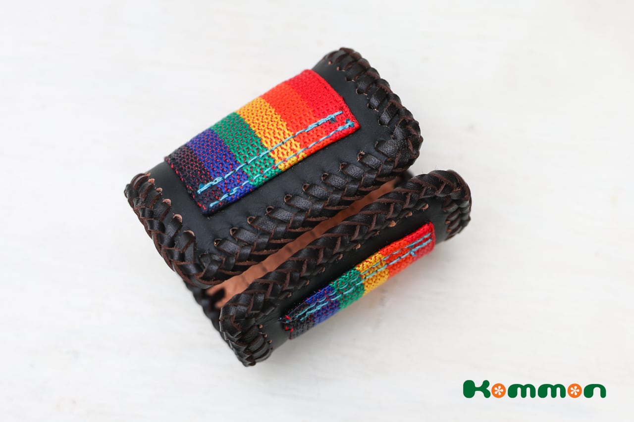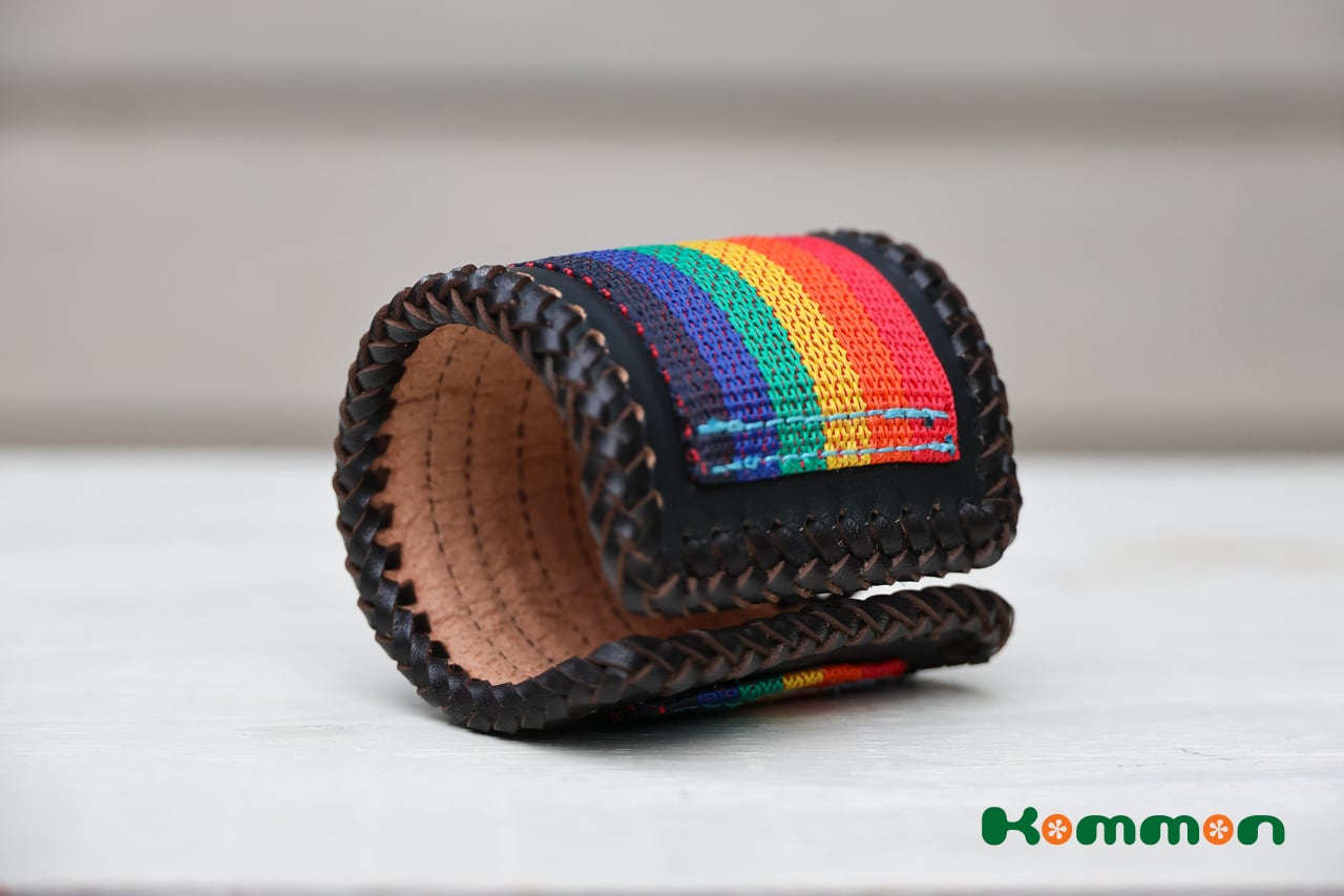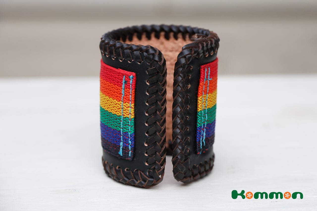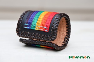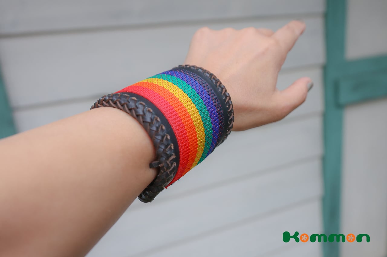 カラフルな虹色が手元を鮮やかに彩る、極太レザーバングル。