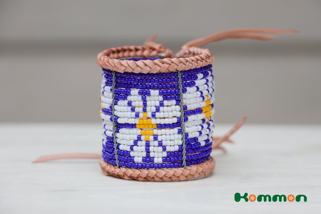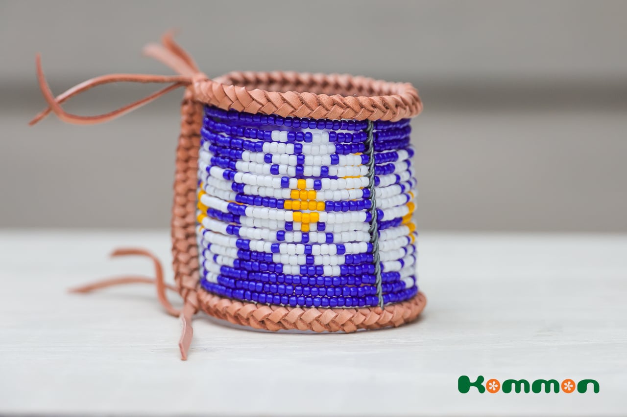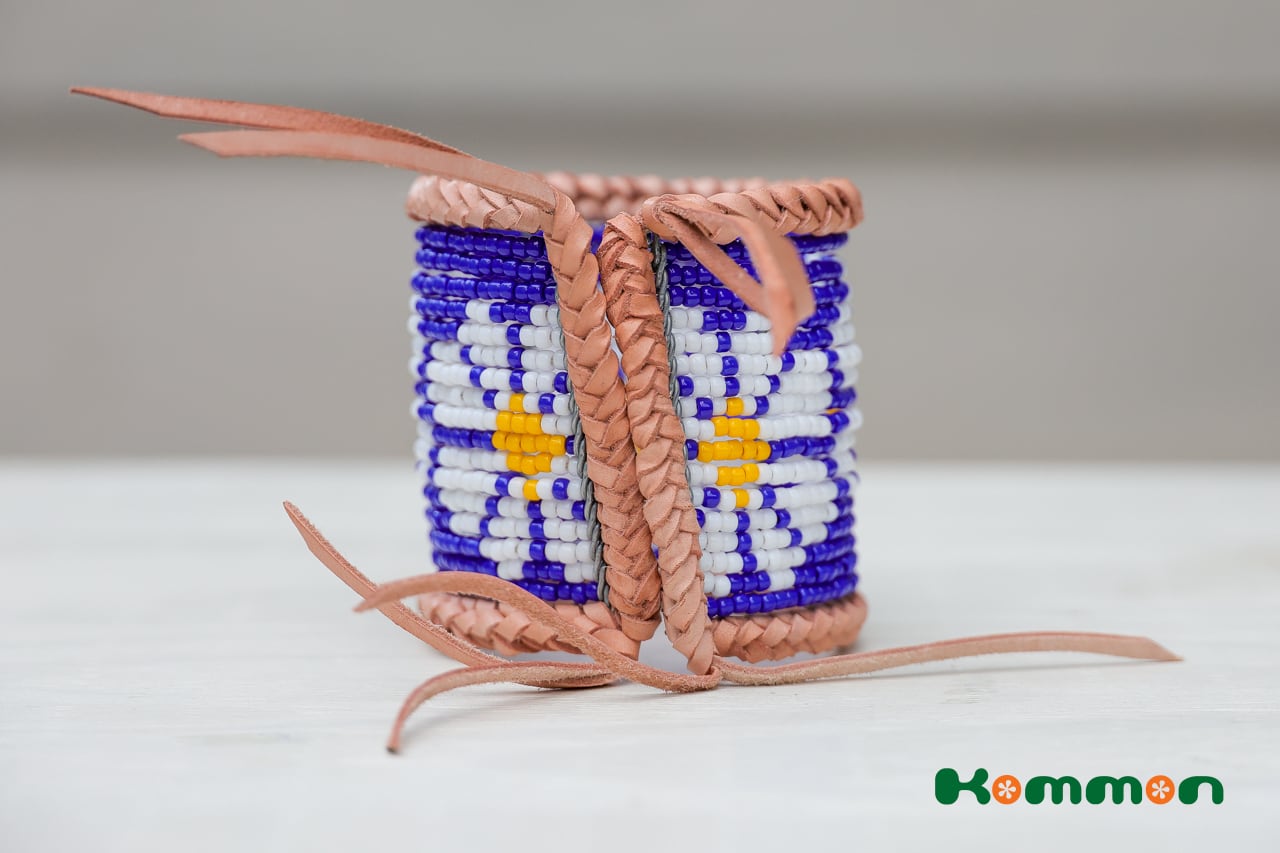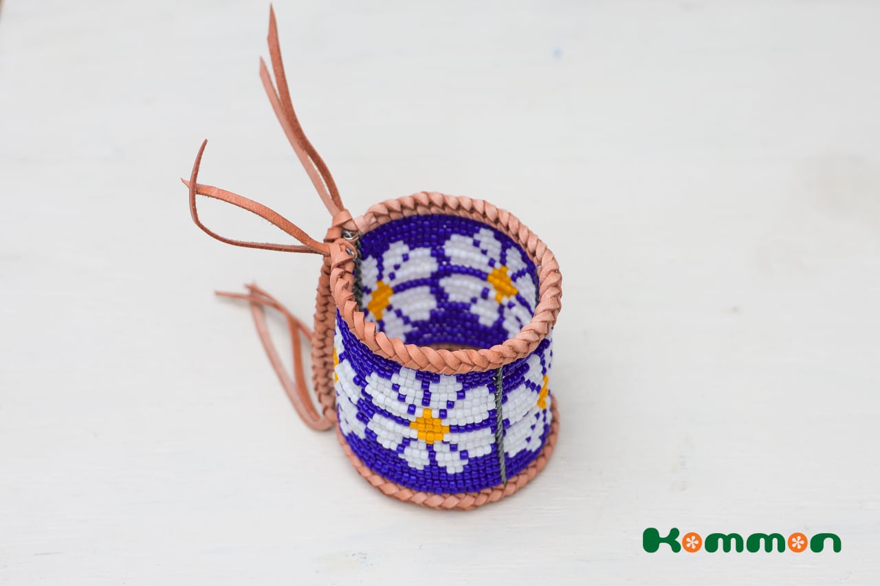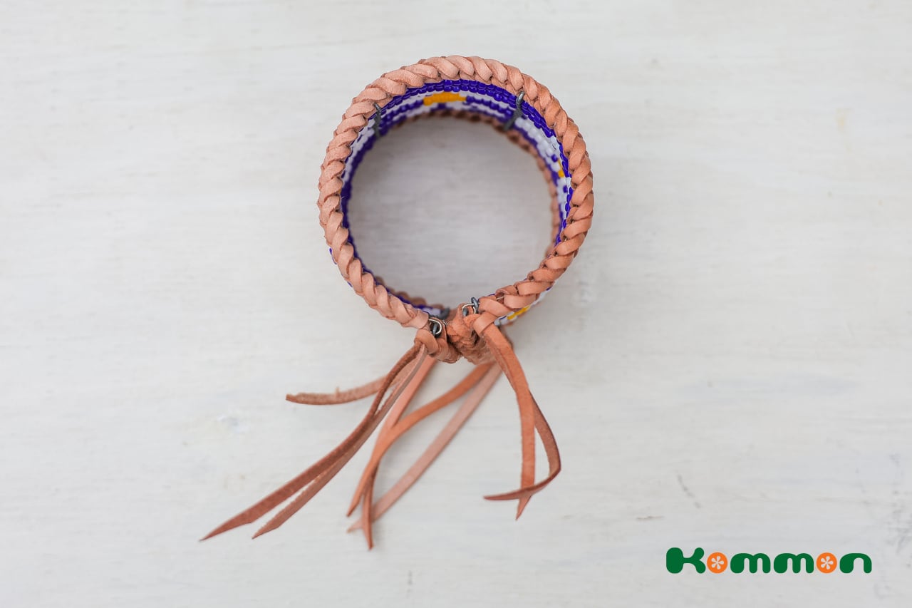 周囲をKommon独自の技法による本革レースでかがり、クラフト感満点のうでわに仕上げました。