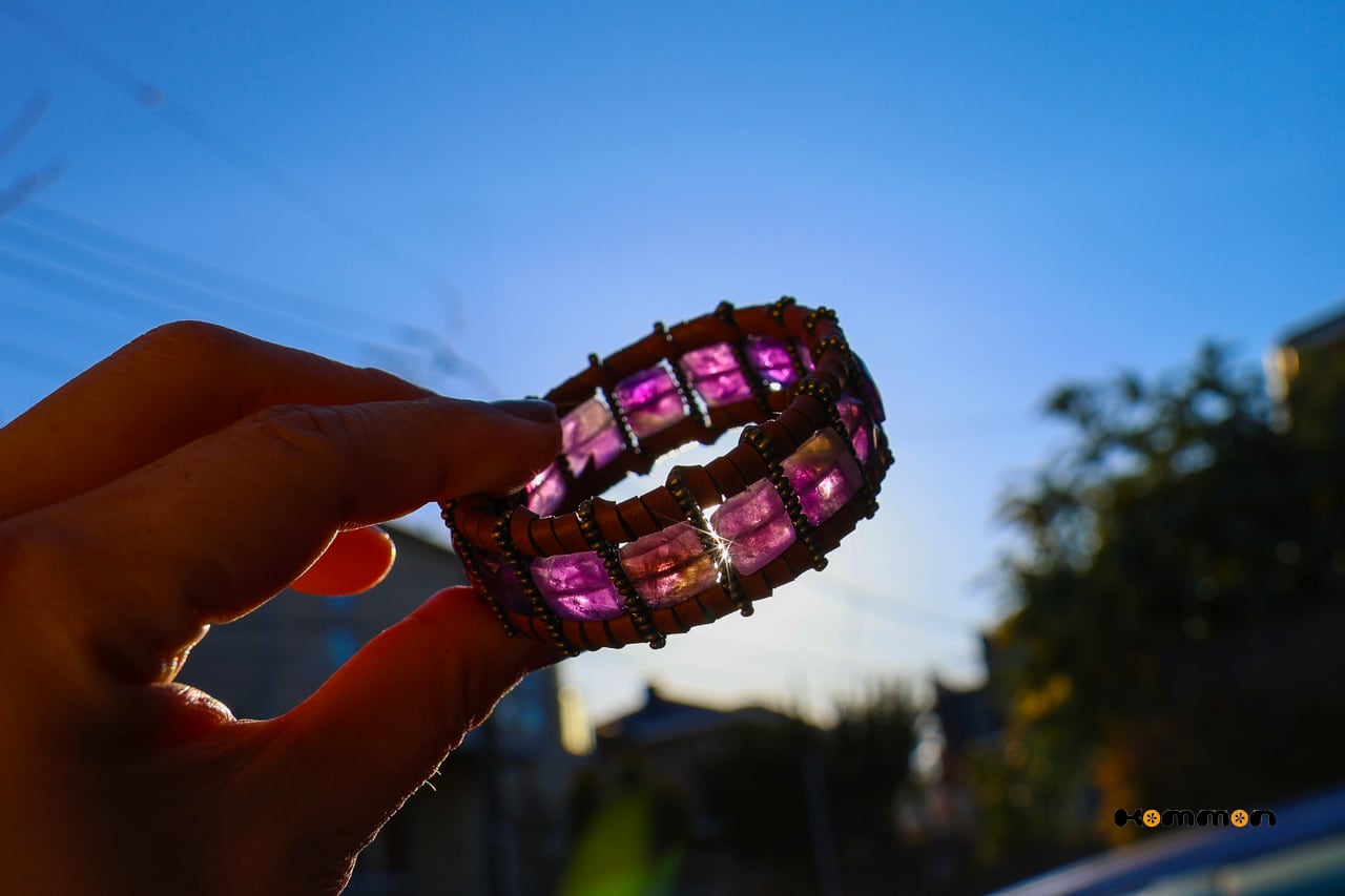 素材■蛍石(天然石)、本鹿革、メタルビーズ、メモリーワイヤー