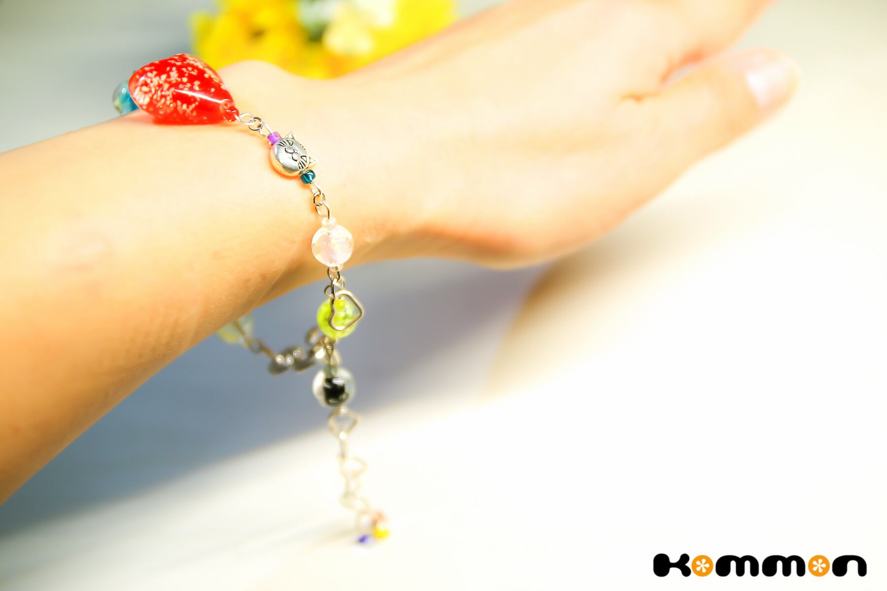 20mmの大粒ハート型ビーズと、7色のラウンド型ガラスビーズに囲まれた猫ちゃんの顔のメタルチャームを組み合わせた可愛らしいブレスレットです。