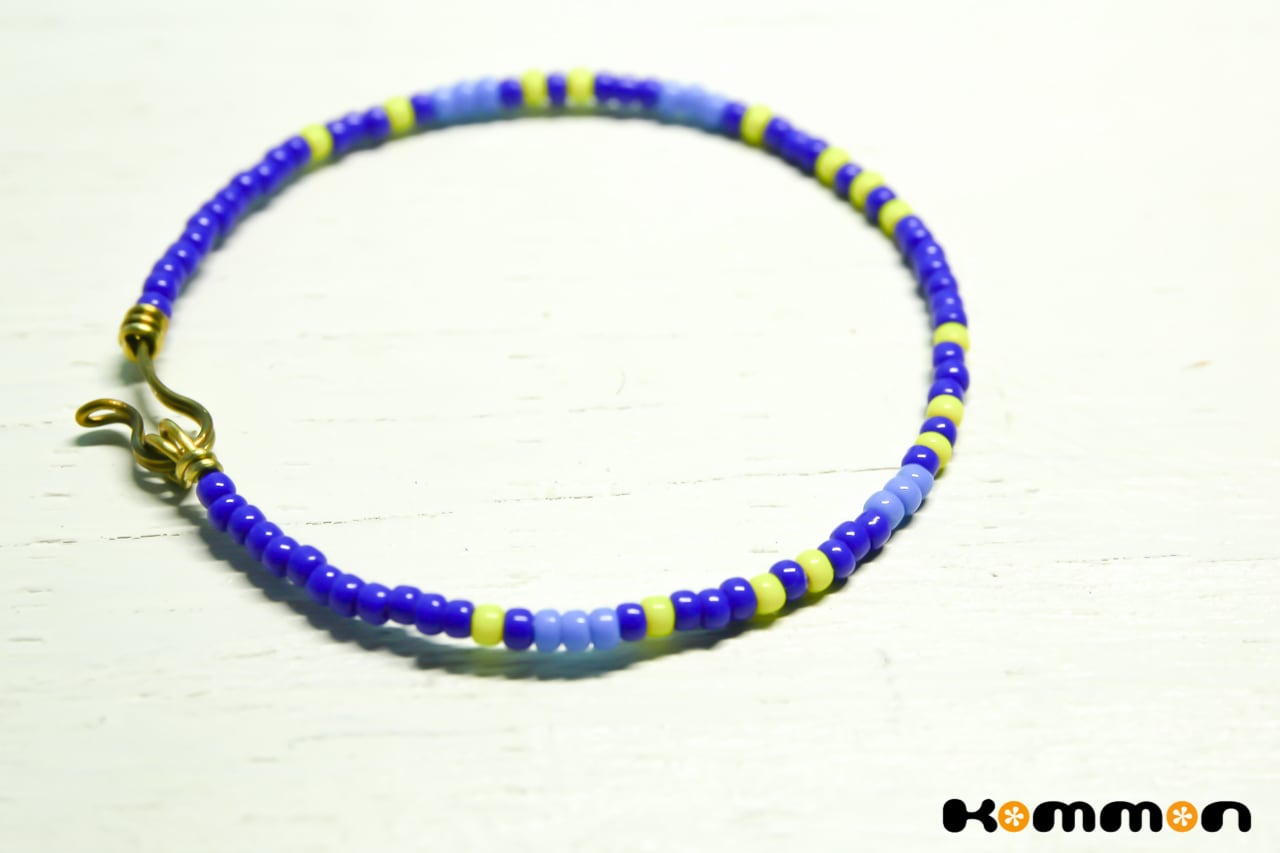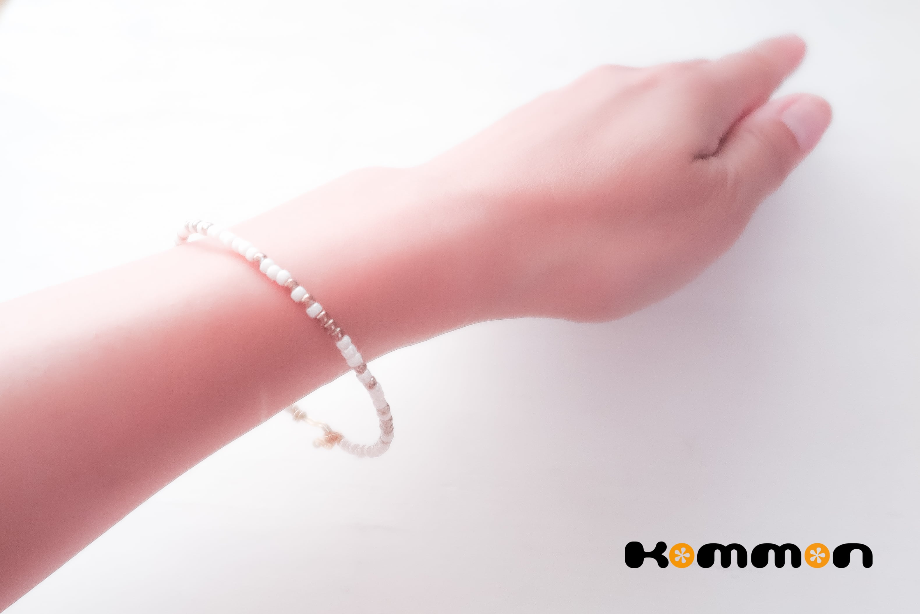 Kommonのうでわはワイヤーを使用しておりますので円形の形が崩れることはありません。したがって、糸やテグスのブレスレットよりやや大きめサイズとなっておりますが、外れにくく軽い装着感となっております。