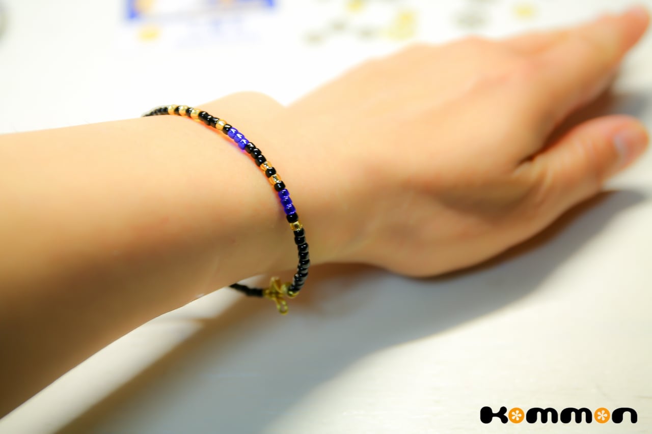 Kommonのうでわはワイヤーを使用しておりますので円形の形が崩れることはありません。したがって、糸やテグスのブレスレットよりやや大きめサイズとなっておりますが、外れにくく軽い装着感となっております。