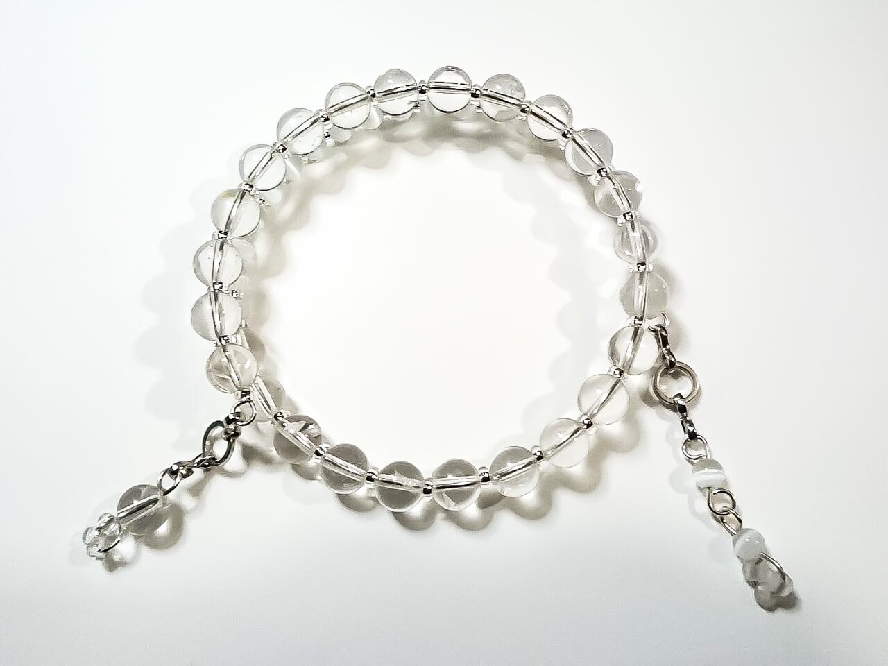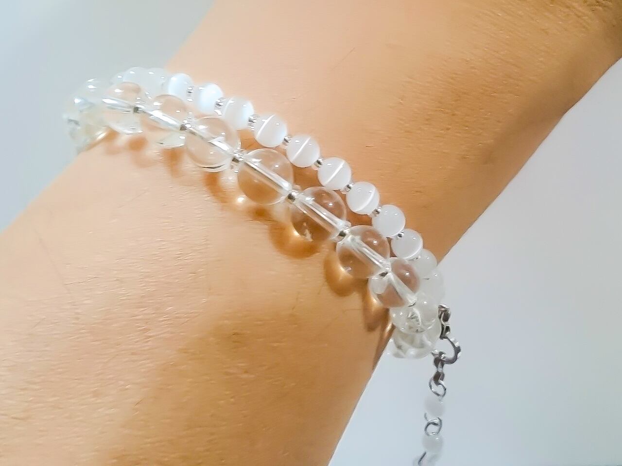 素材■クラック水晶(天然石)、キャッツアイ(人工石)、国産グラスビーズ、ステンレス製メモリーワイヤー