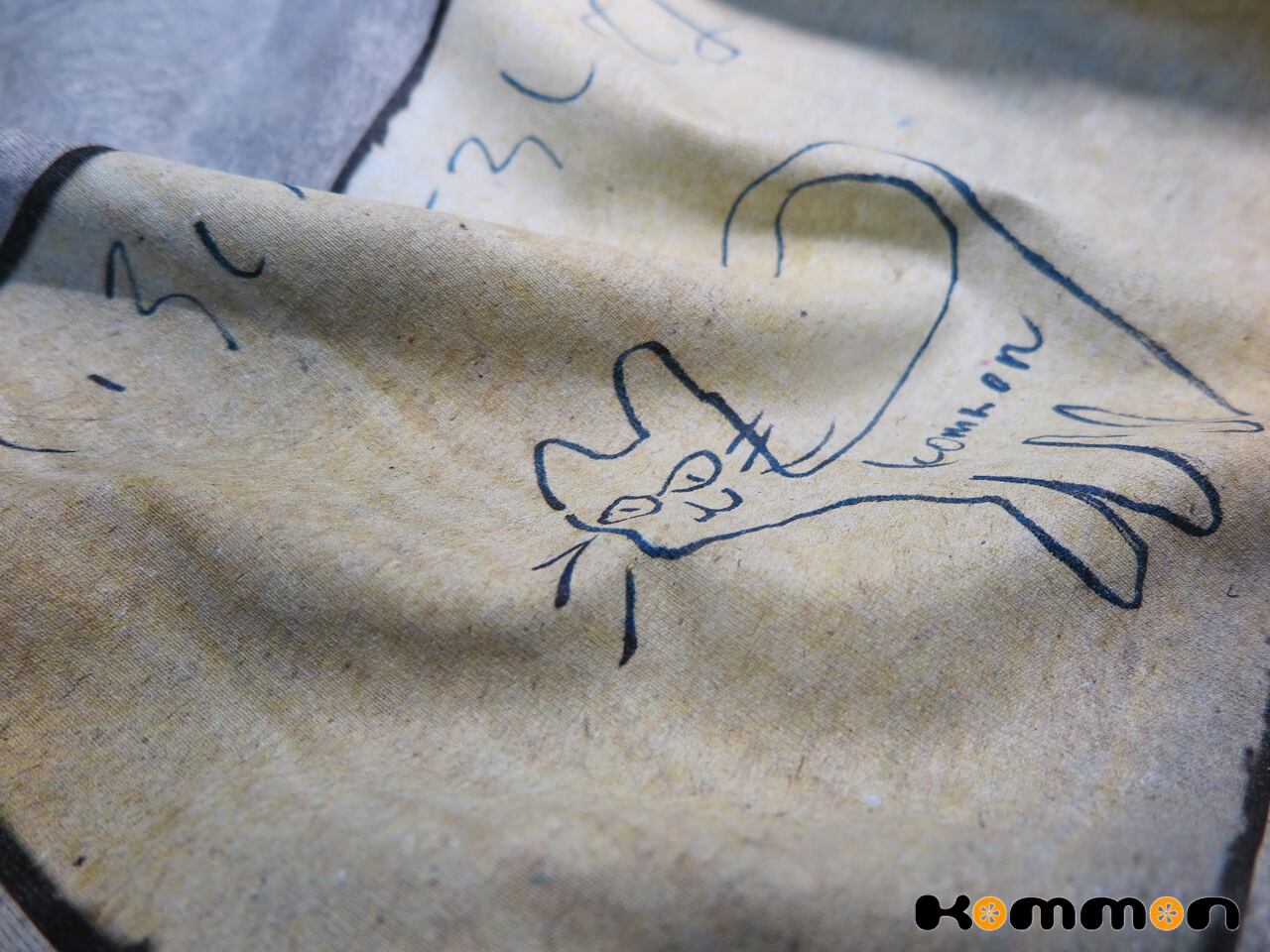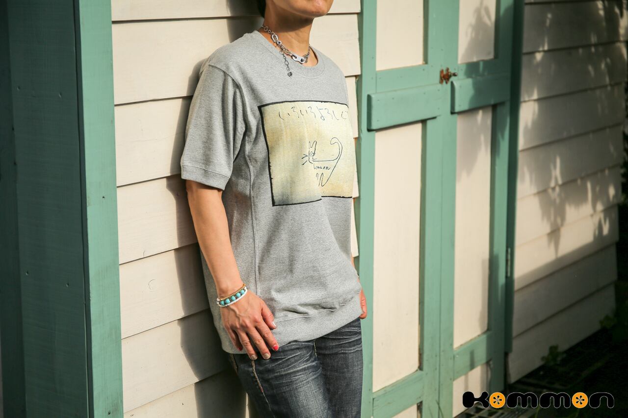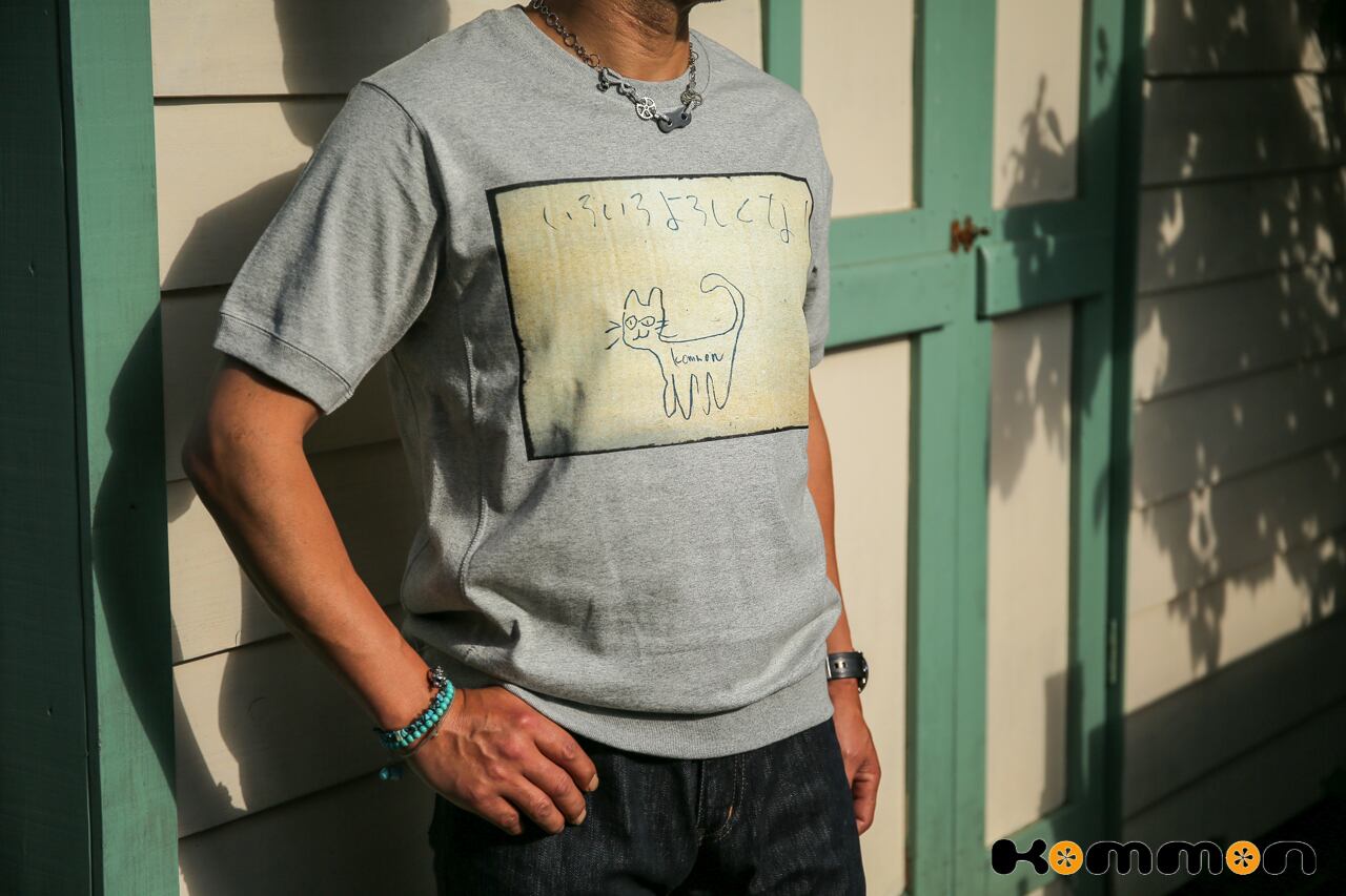 Kommonの小森義也による猫のイラストをフィーチャーしたTシャツです。
