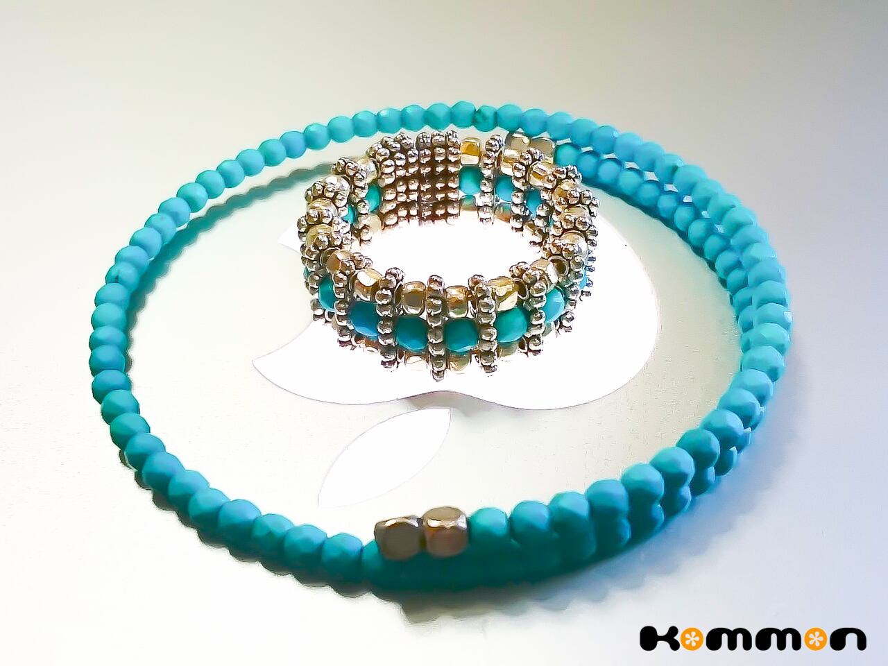素材■ハウライトターコイズ(着色)、メタルビーズ、ステンレス製メモリーワイヤー