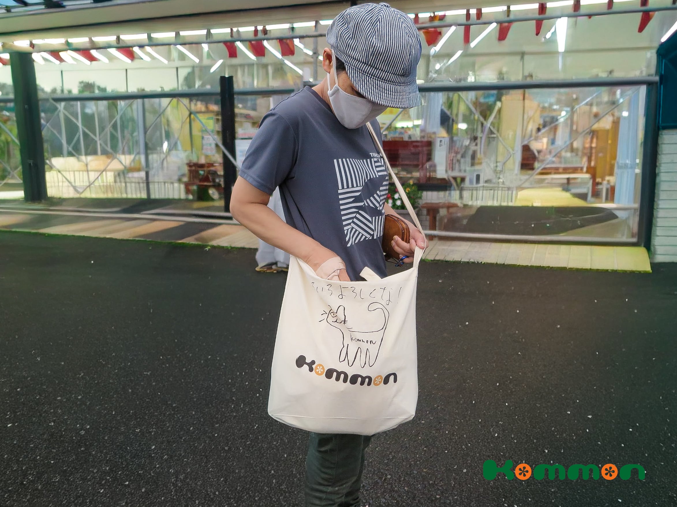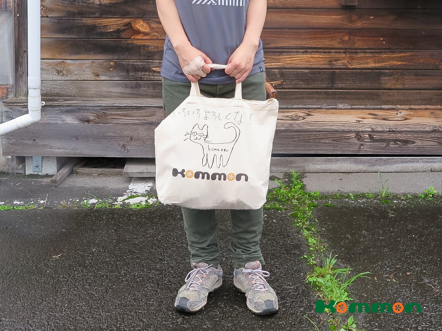 Kommonのアーティスト小森義也によるKommon猫のイラスト入りトートバッグです。