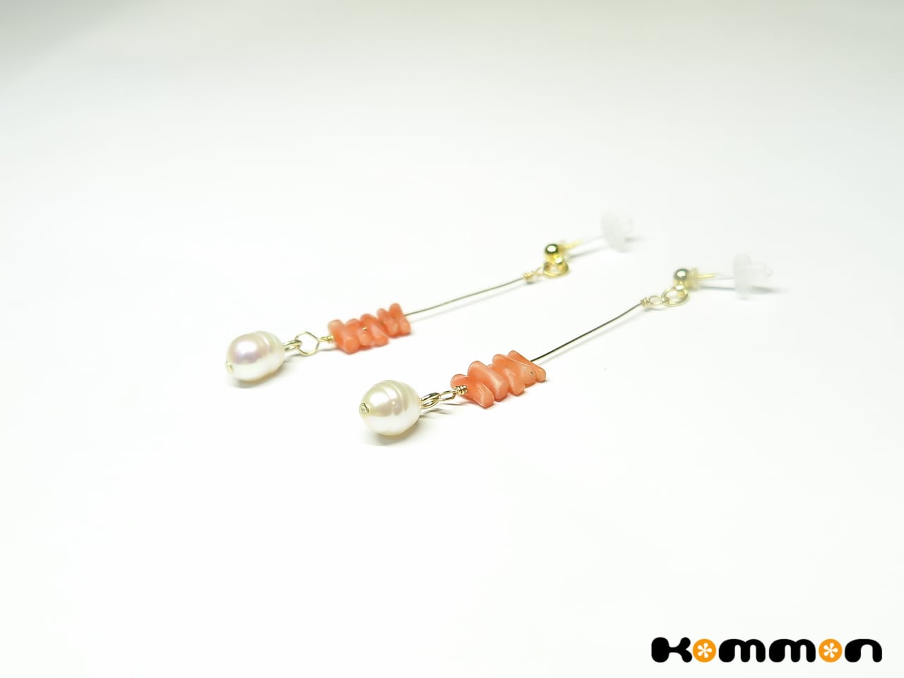 淡いピンクの珊瑚と、淡水パールを細いゴールド色のワイヤーで組み合わせた耳飾りです。