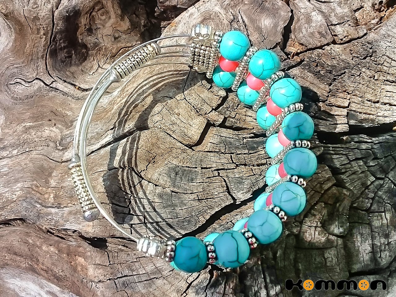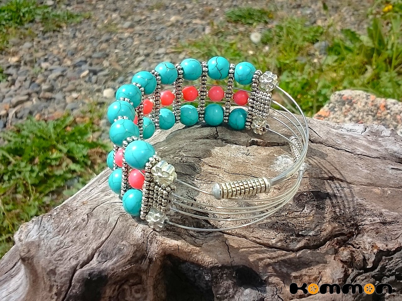 ターコイズと大きめピンクサンゴをメモリーワイヤーで組み合わせてバングルに仕立てました。