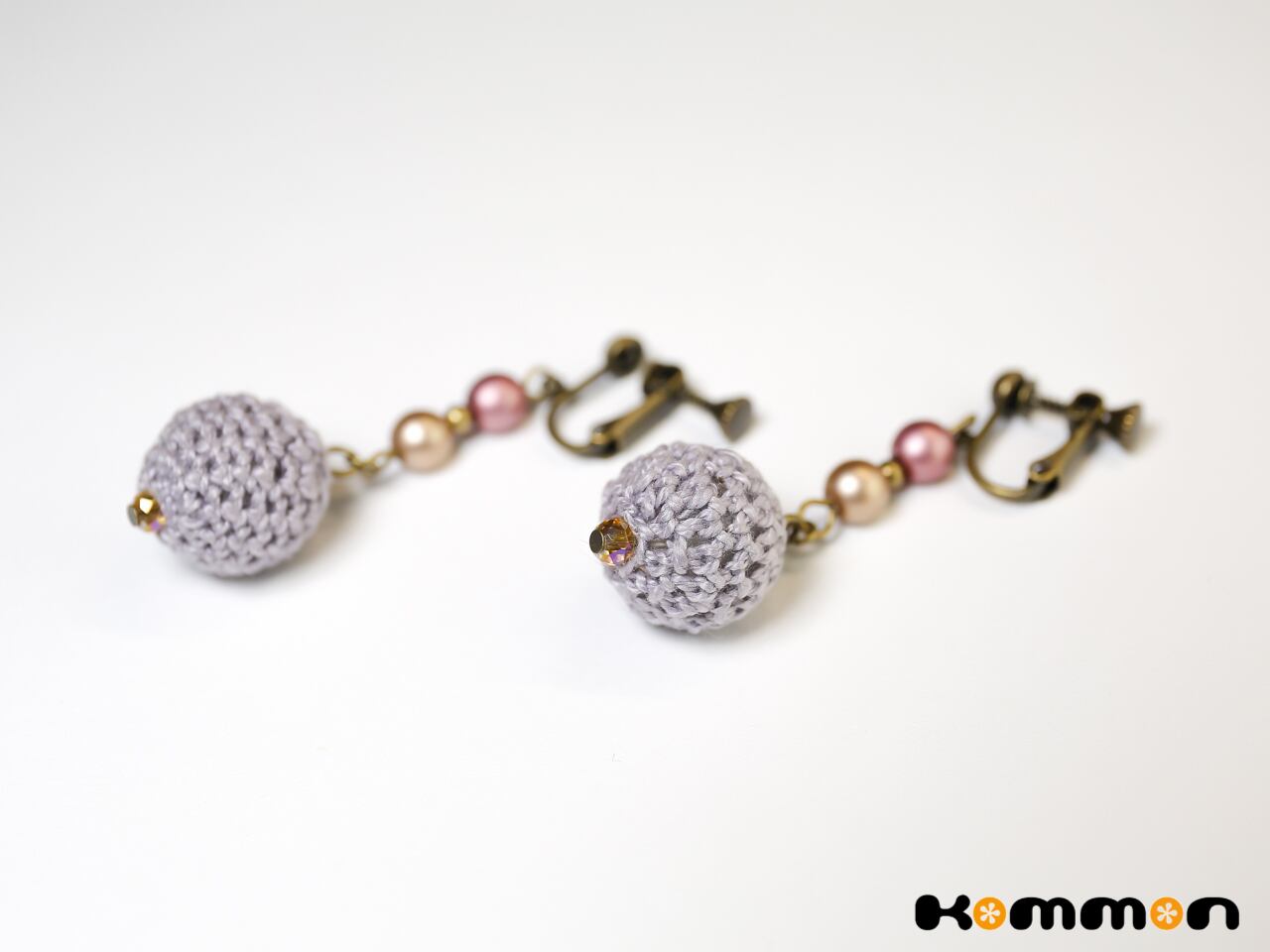 大ぶりのアクリルビーズはニットでくるまれており、くすみカラーのピンクとシャンパンゴールドのパールビーズが彩りを添えます。