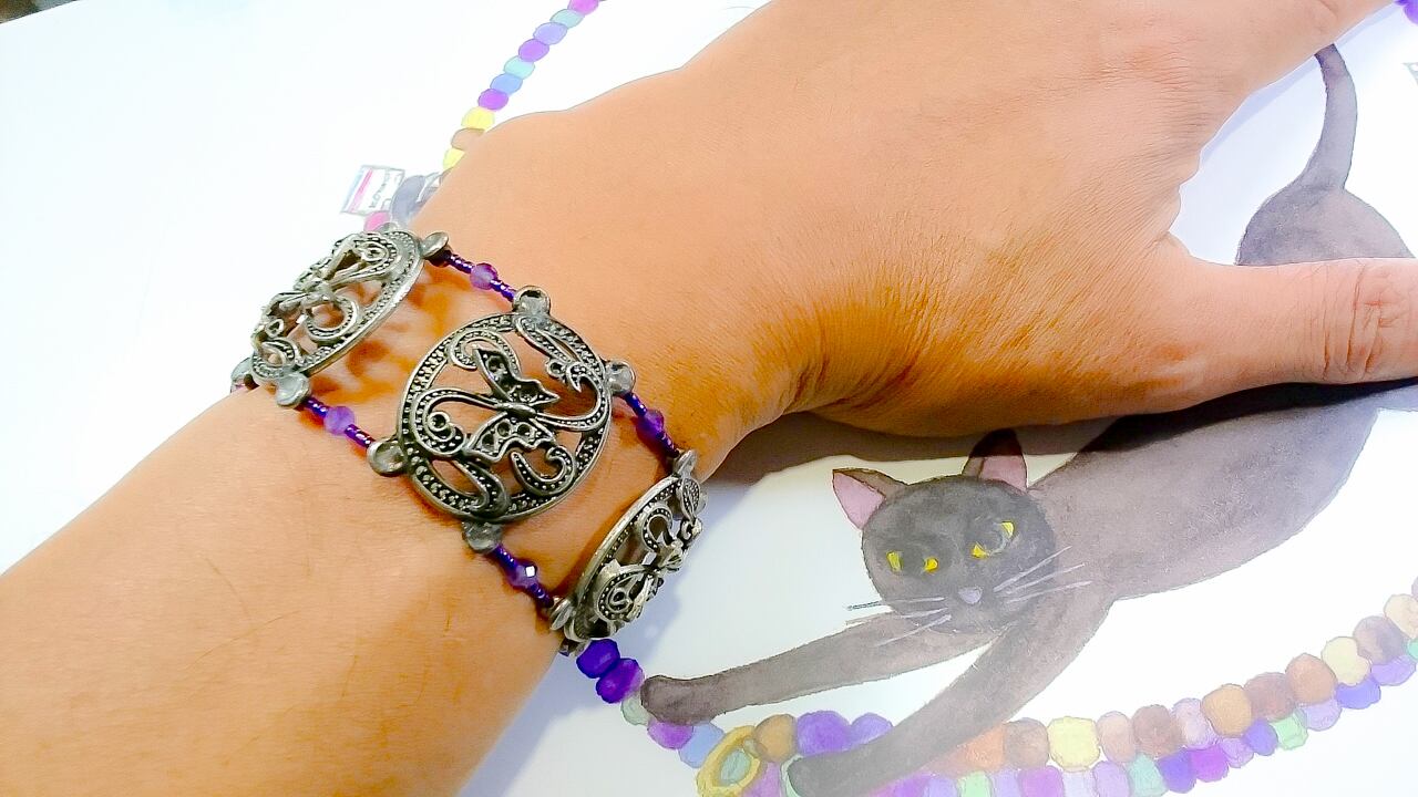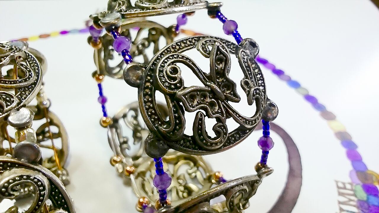 ラオスの民族衣装などに使われる蝶のモチーフのメタルビーズを少し改造し、メモリーワイヤーを通してバングルタイプのうでわに仕立てました。
