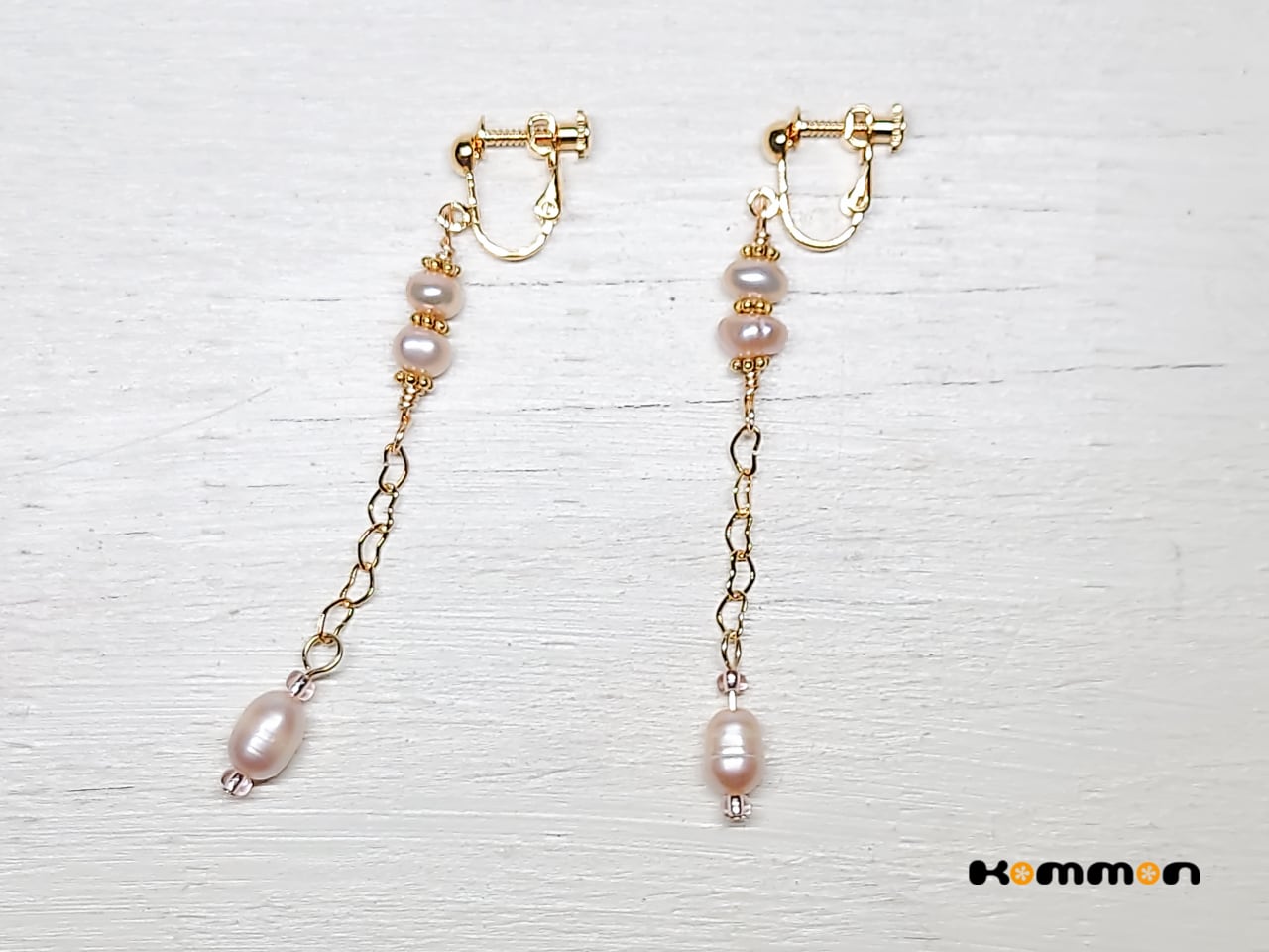 淡いピンク色の不揃いな淡水パール2種類をハート♡のチェーンでつないで動きのある耳飾りにデザインしました。