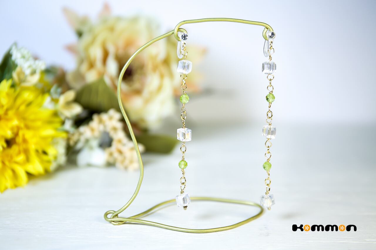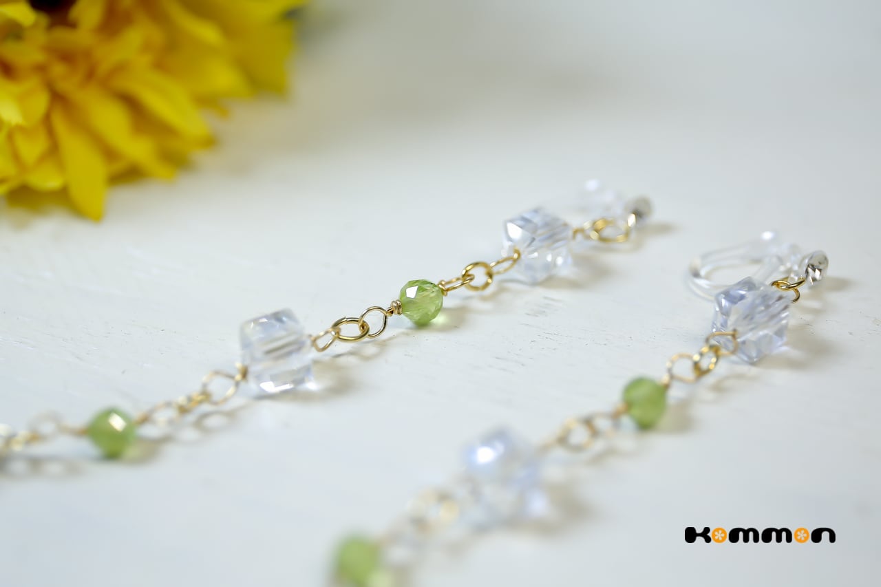 カットが施されたペリドットと、スクエアガラスによって、耳元で美しく輝くことでしょう。
