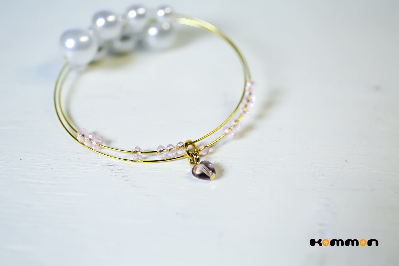 あえてワイヤーを見せるスケルトンデザインで、カットガラスビーズとハートのチャームがゆらゆら揺れて、手元を飾ります。