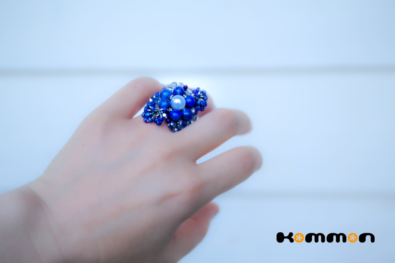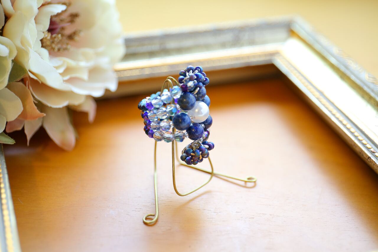ゆびわのエンド部分には艶消しで深いブルーの特別なビーズによるぼんぼりを取り付け、指の動きに合わせて揺れる、動きもあるデザインとなっています。