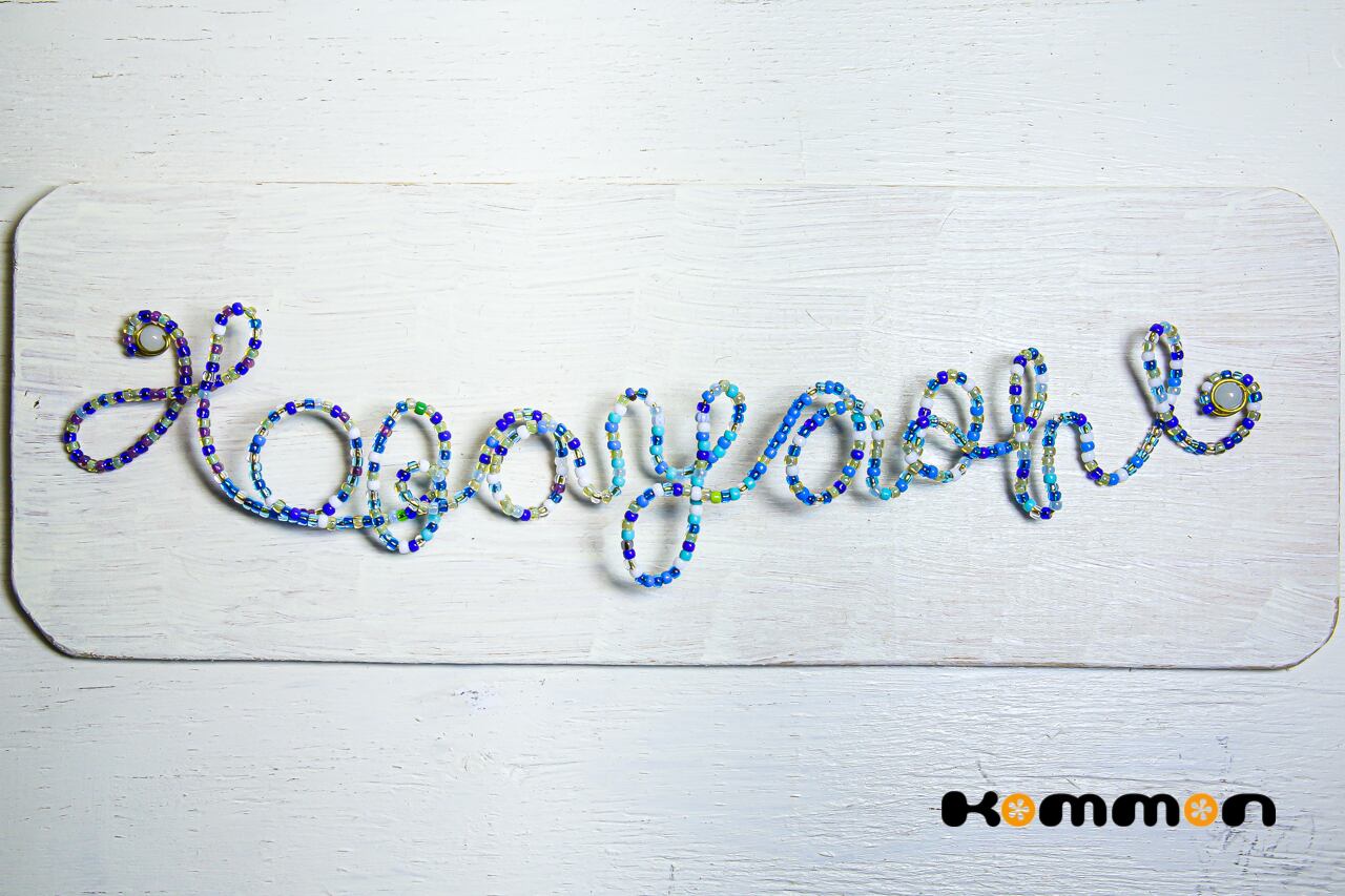 ビーズをワイヤーワークでつなぎ、筆記体で文字を描く表札です。