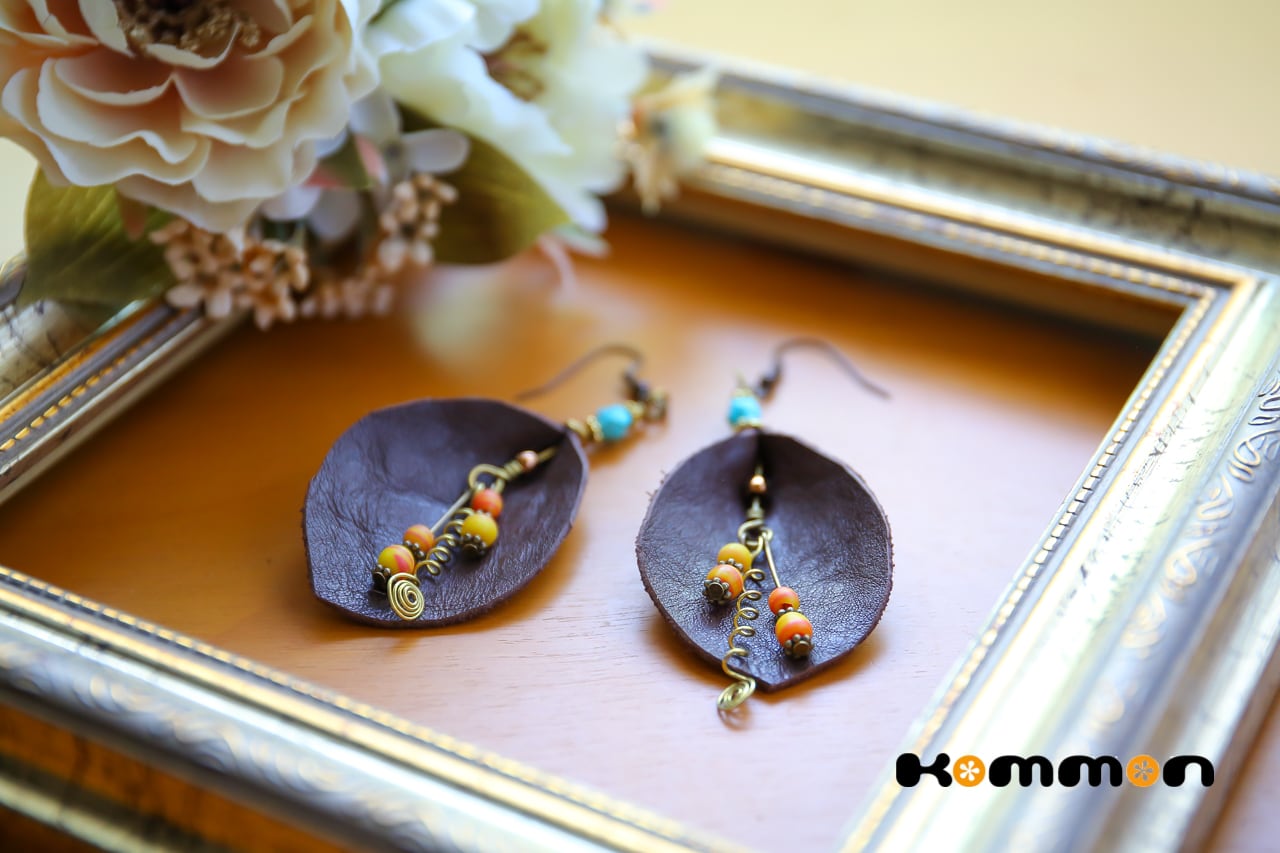 本革による葉っぱに、たわわに実った木の実(チェコビーズ等)、