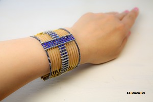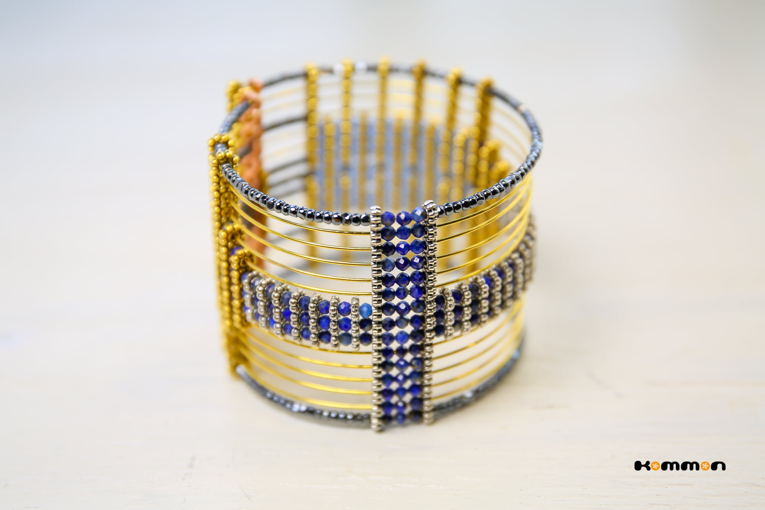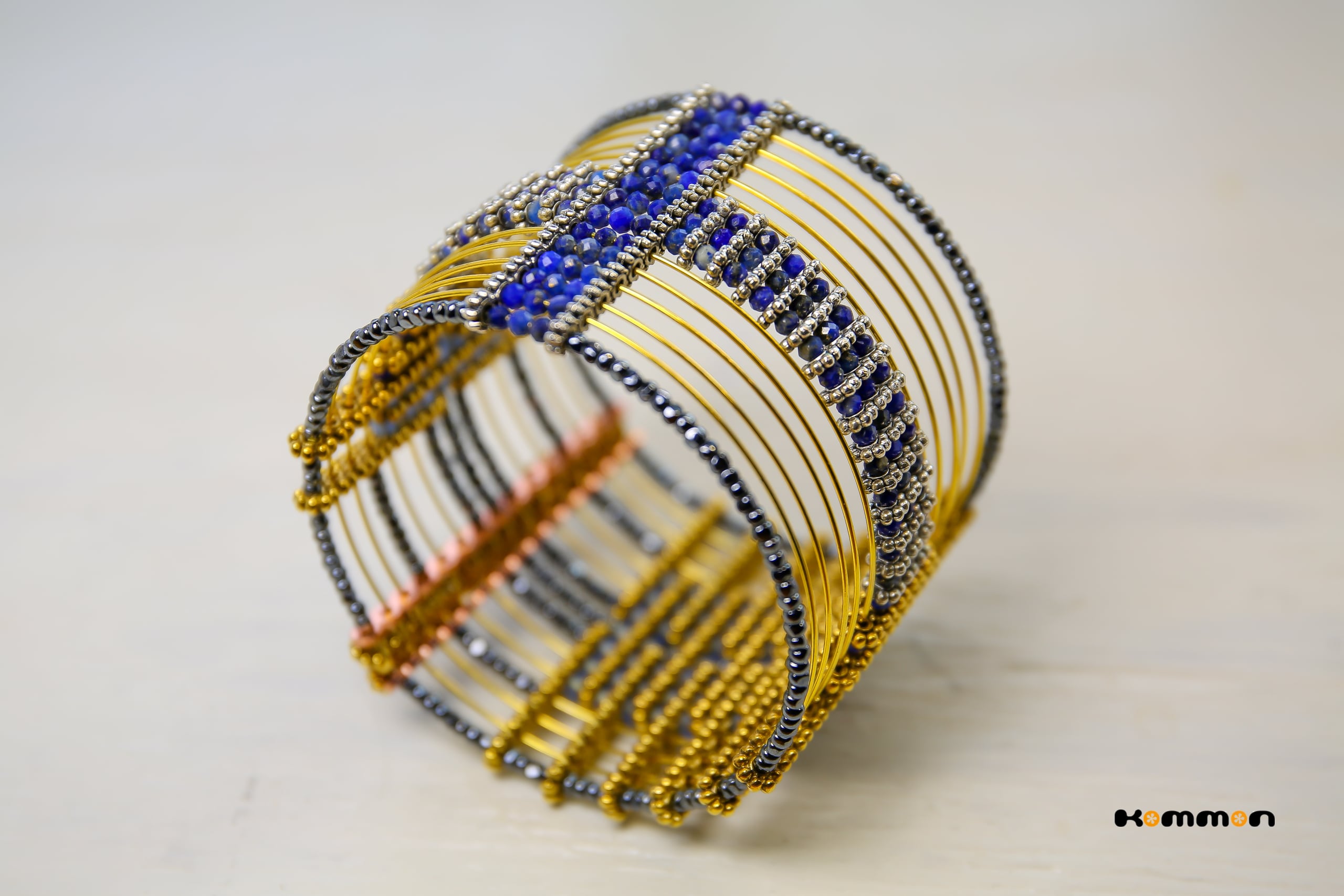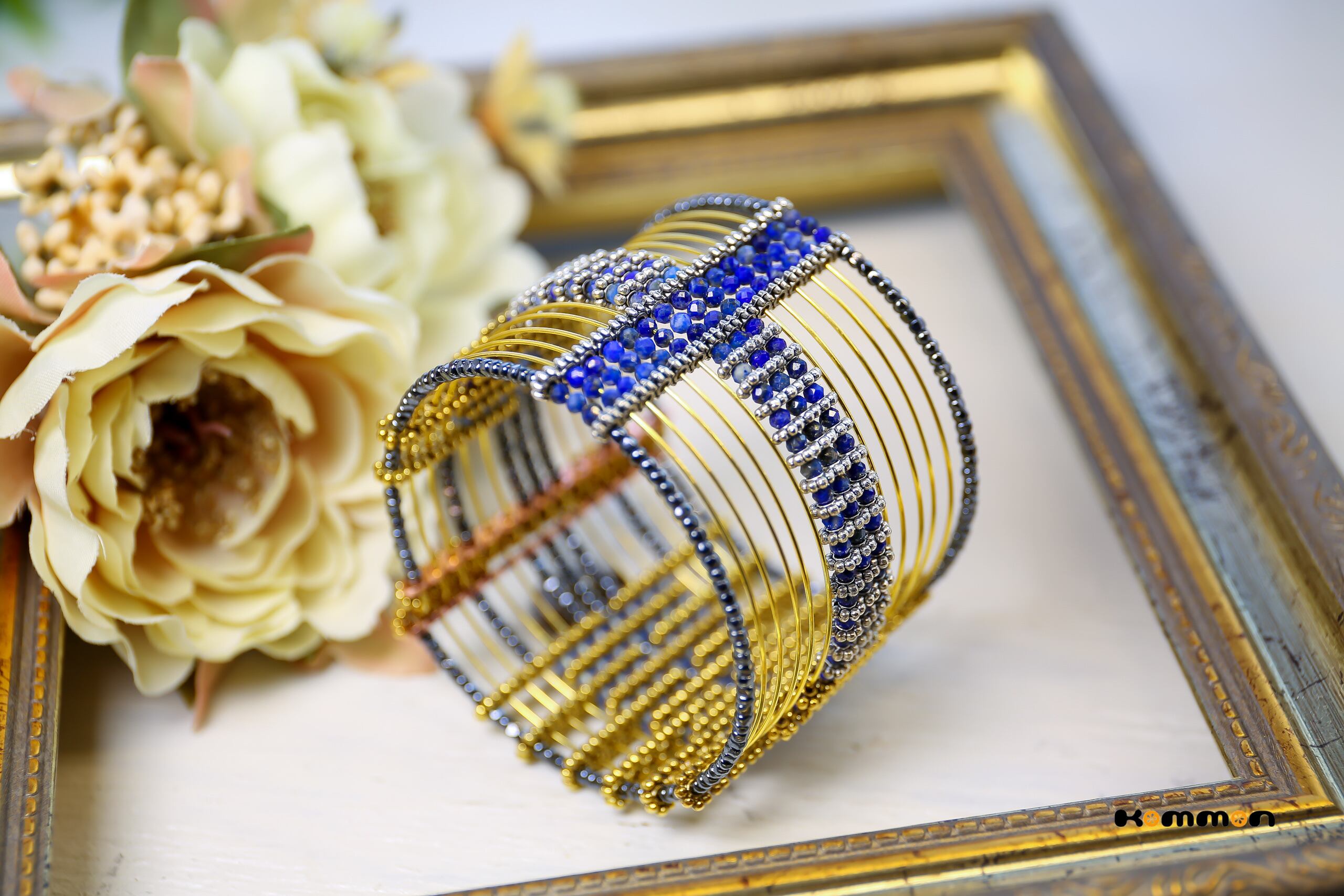 むき出しのワイヤーと2mmのカット加工がされた小粒のラピスラズリ、メタリックなシードビーズとメタルビーズを組み合わせてクロスを表現した極太うでわです。