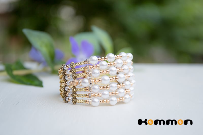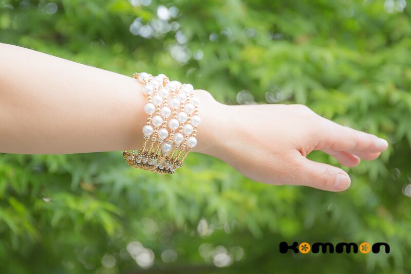 ゴールドのメタルビーズと、キラキラ光るロンデルが全体のデザインを引き締め、手元をゴージャスに飾ります。