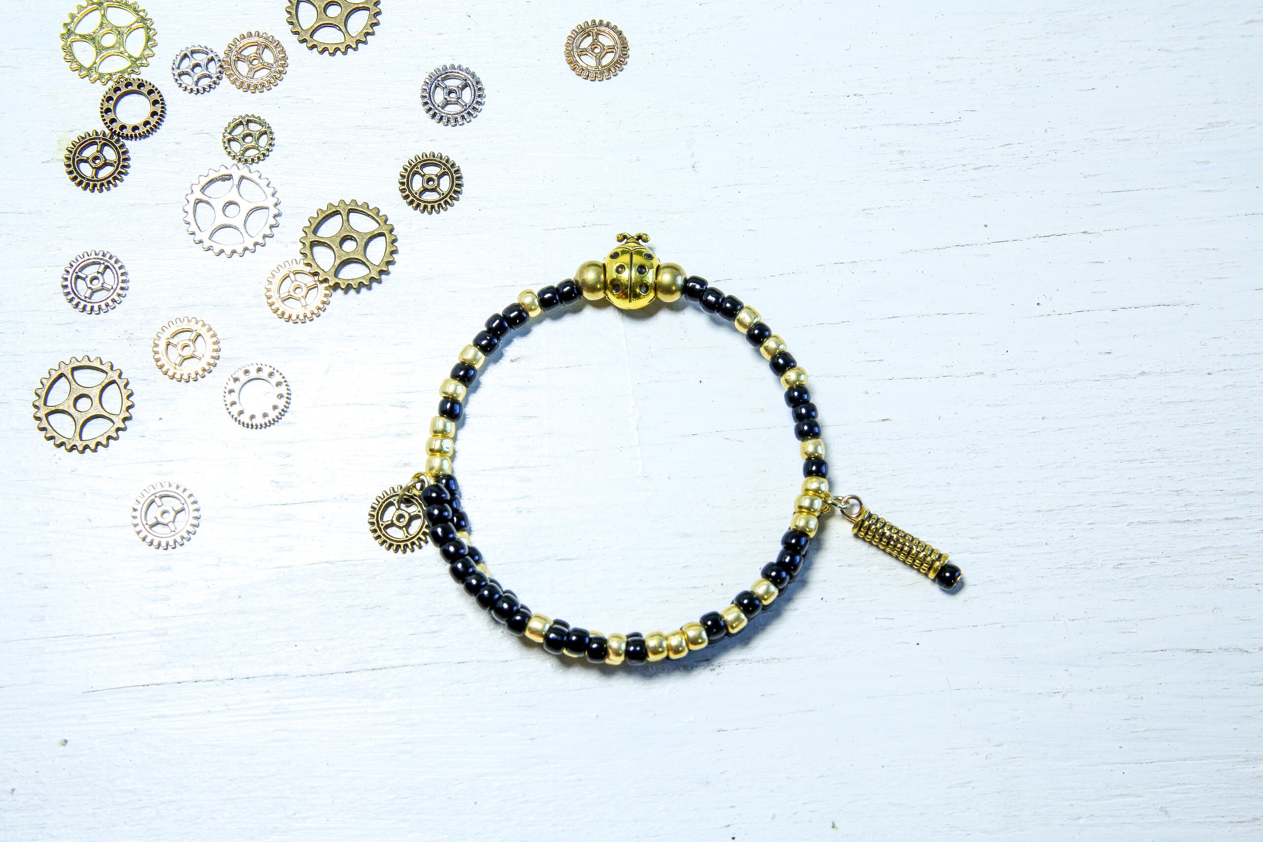 ブレスレットのエンド部分には、バイクをモチーフにした「スプロケット」と「グリップ」のメタルチャームを取り付けました。