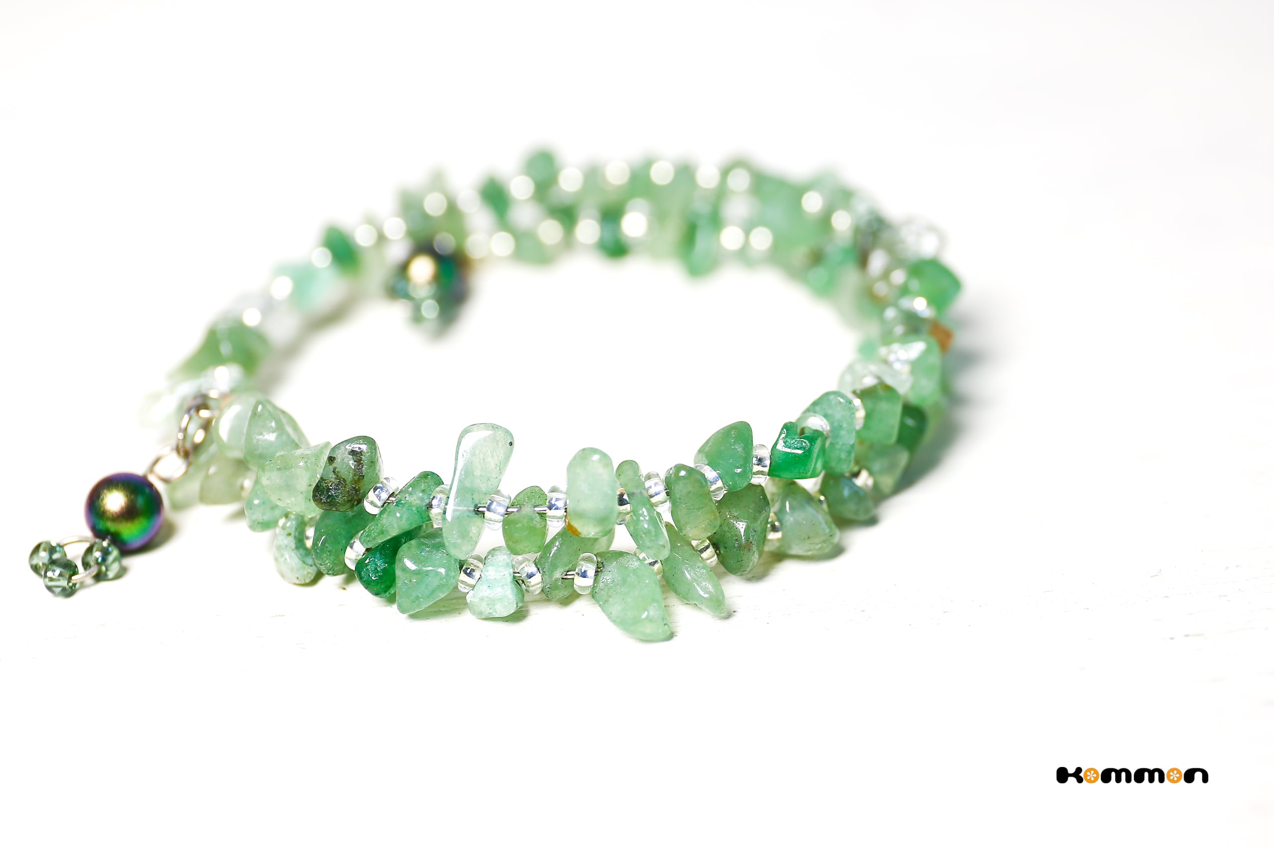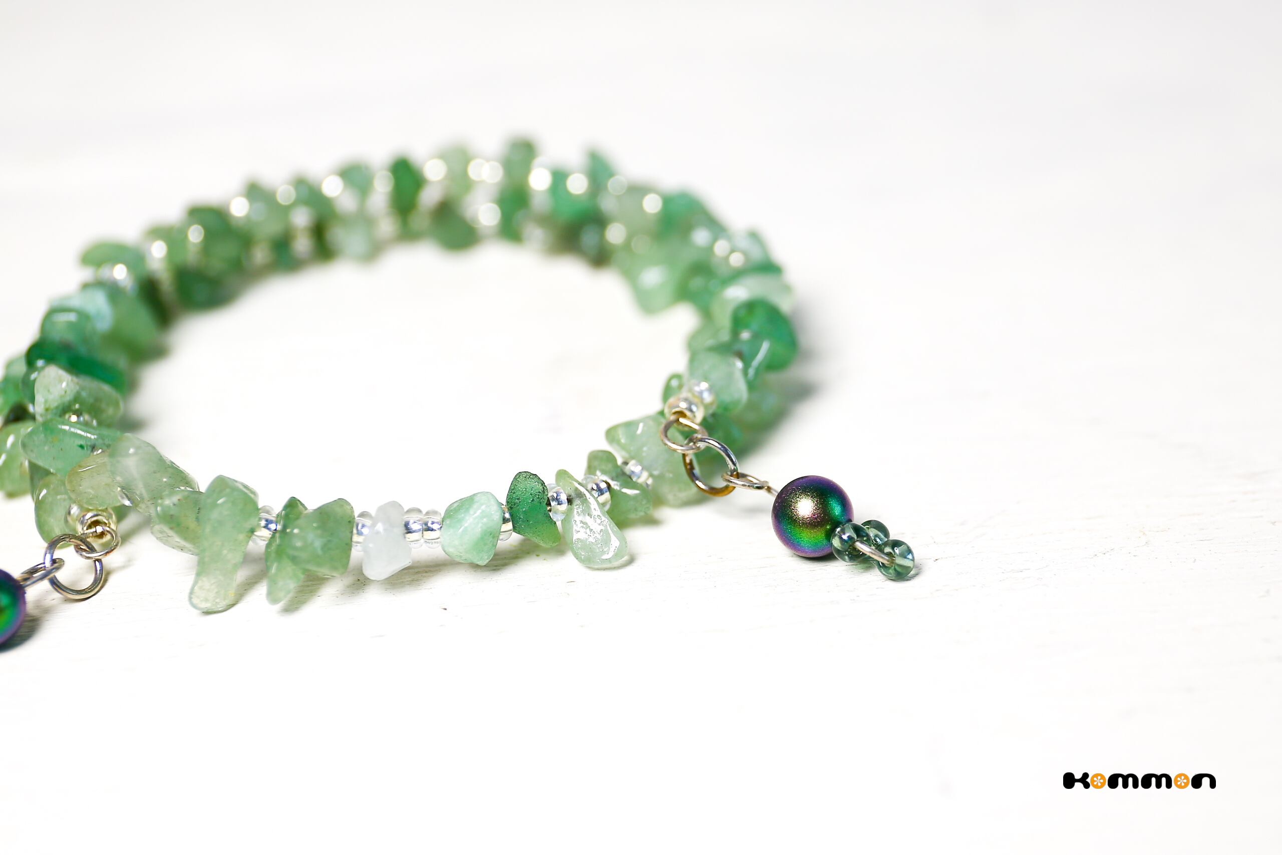 グリーンアベンチュリンのサザレ石の間にガラスシードビーズを挟み込み、さらに輝きを増しました。