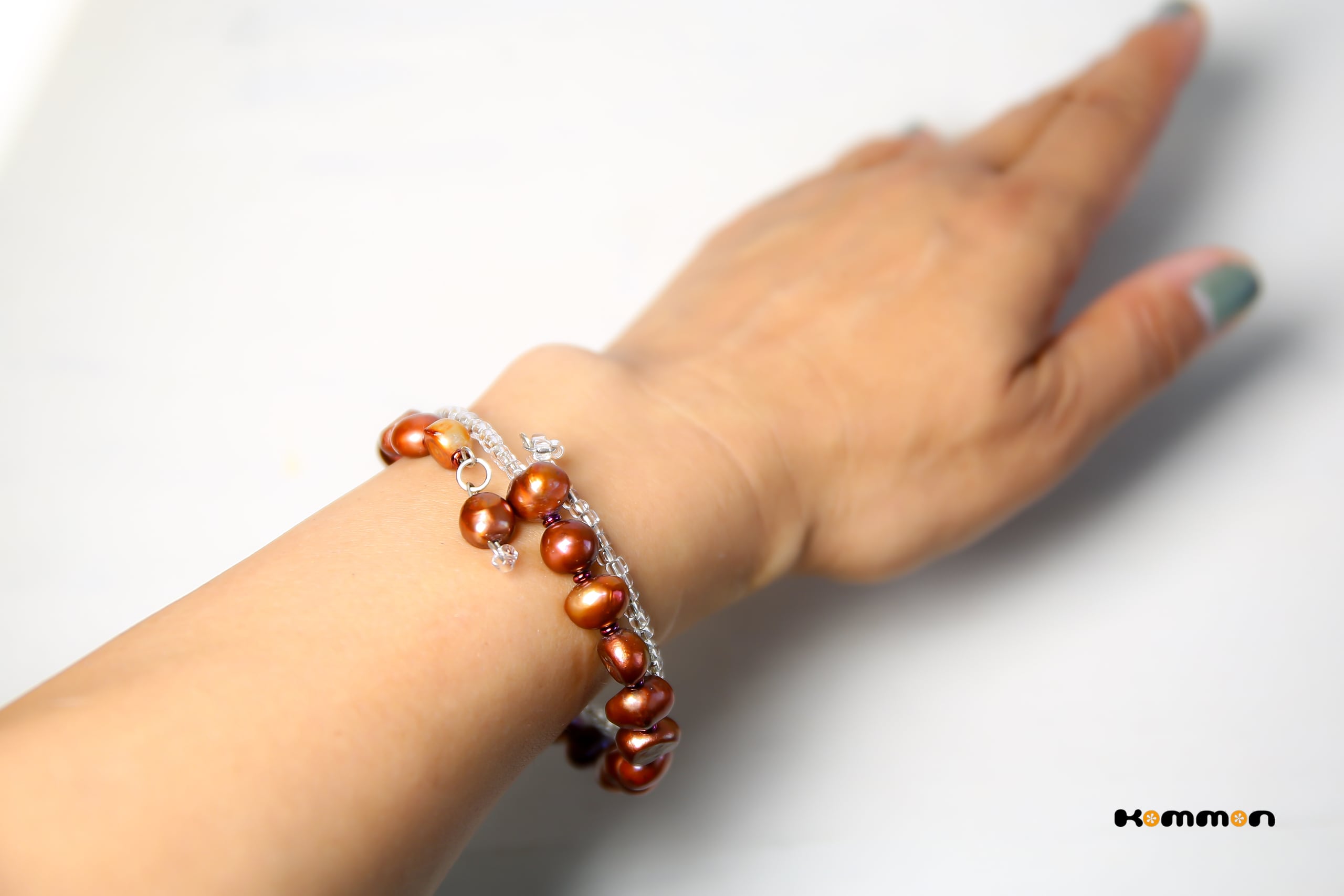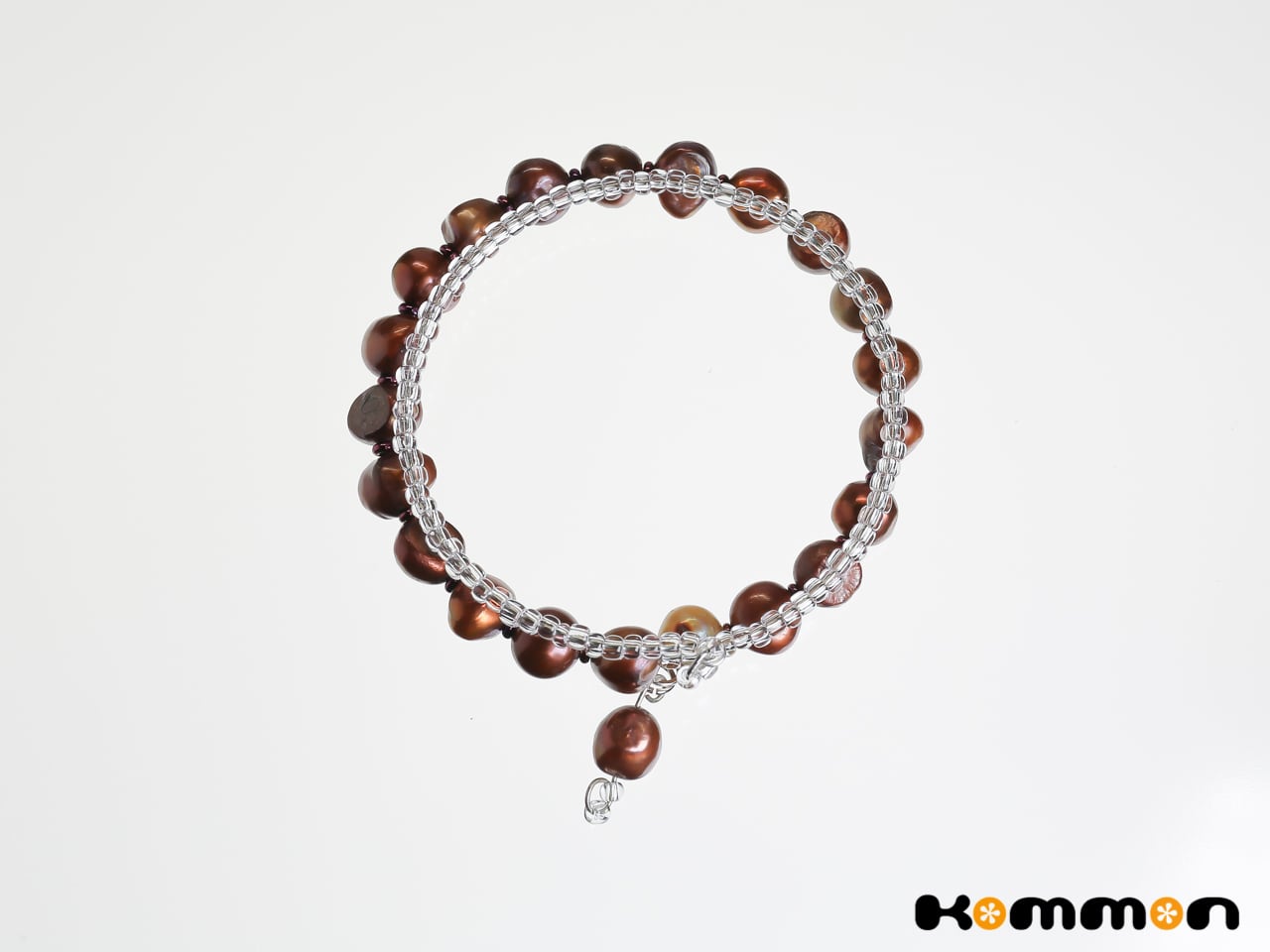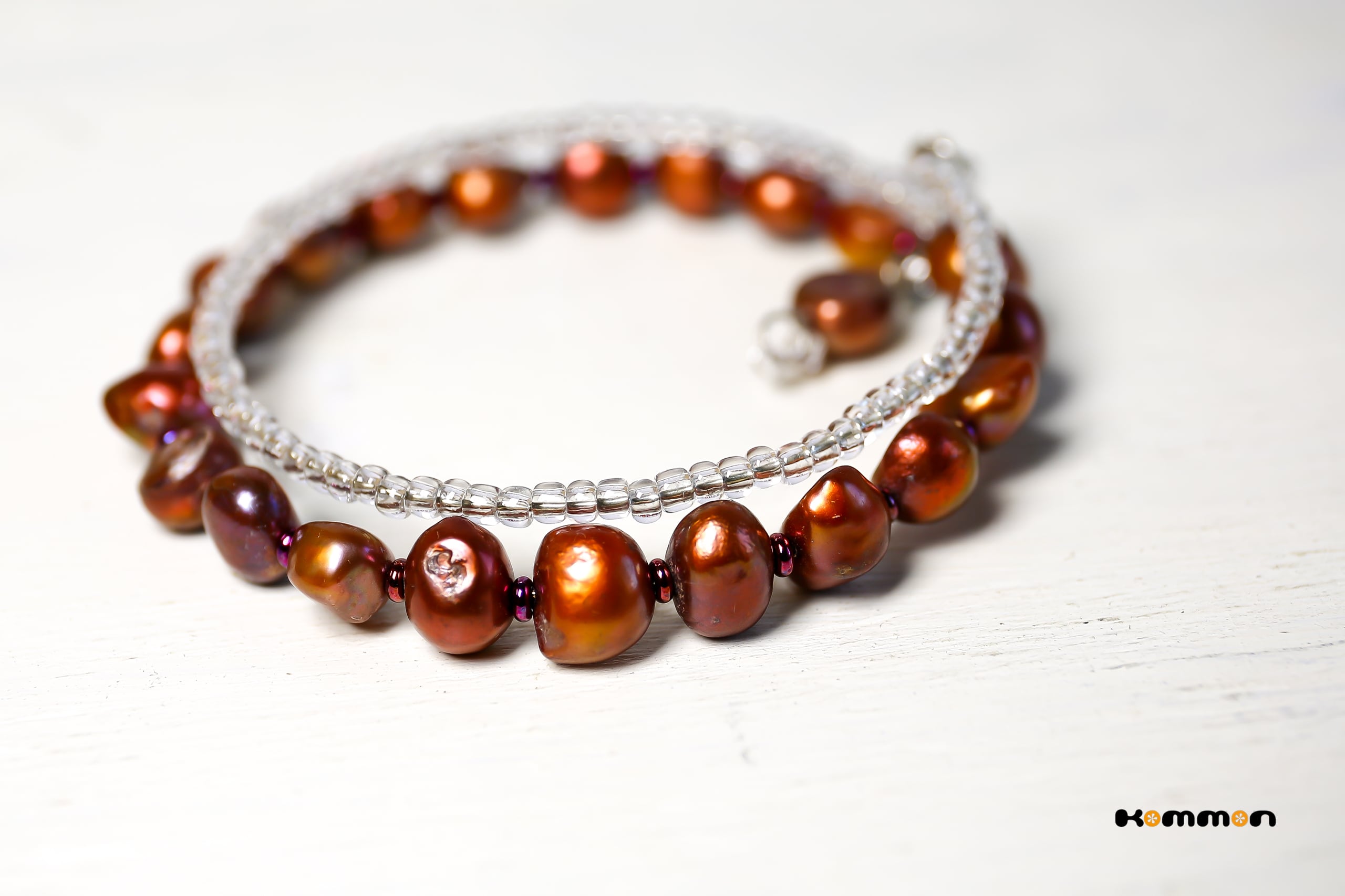 ブロンズカラーの淡水パールとシードビーズを組み合わせ、重ね付けのように見える二重巻きのうでわに仕立てました。