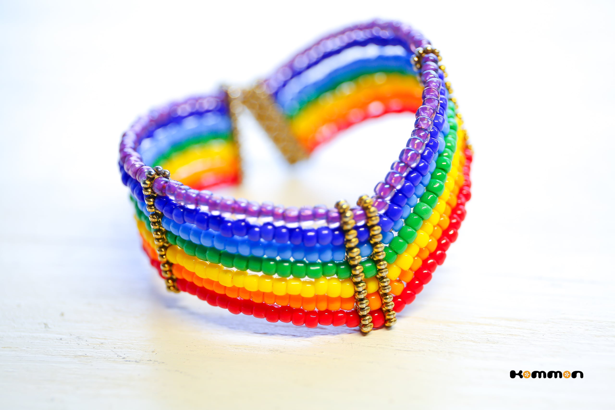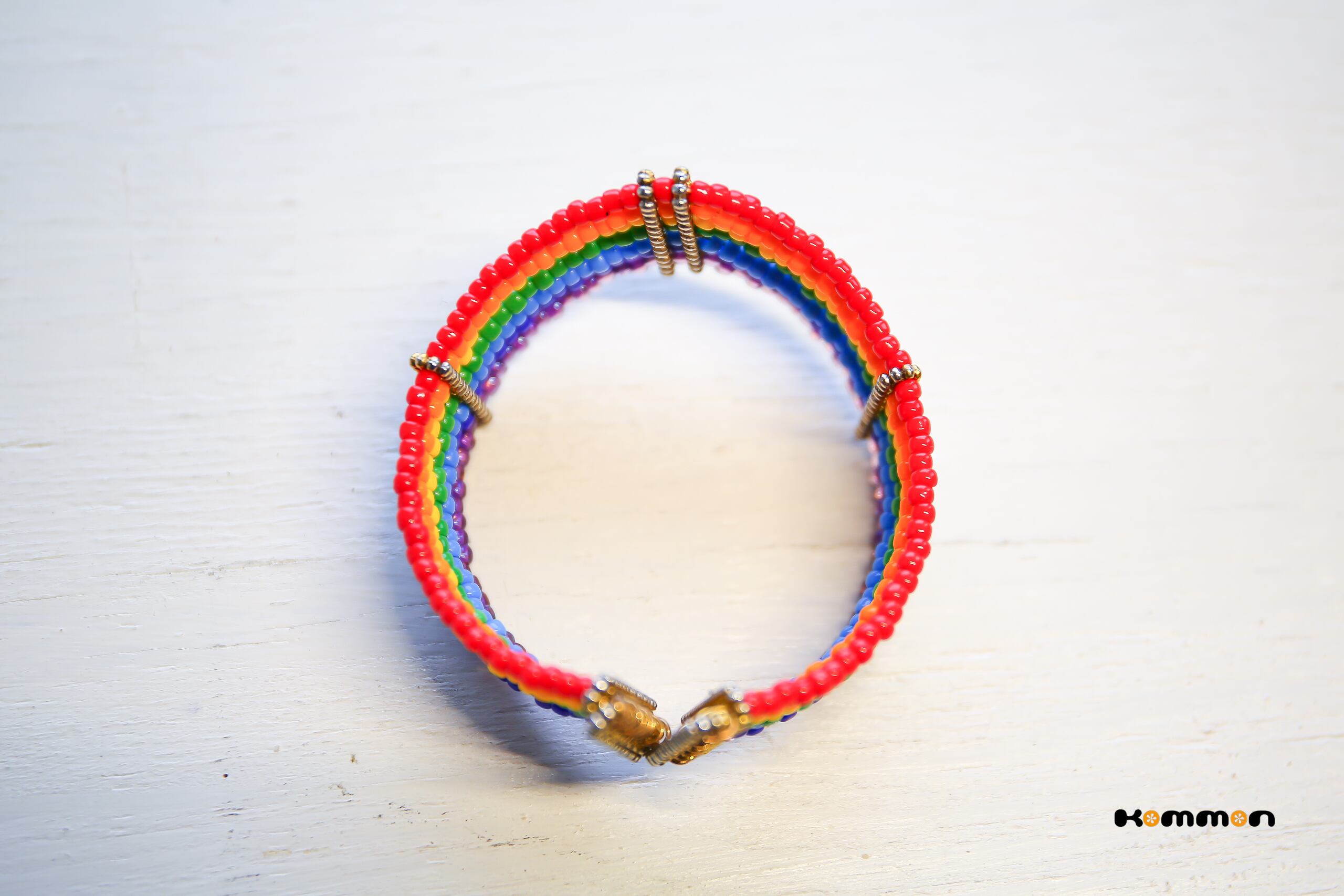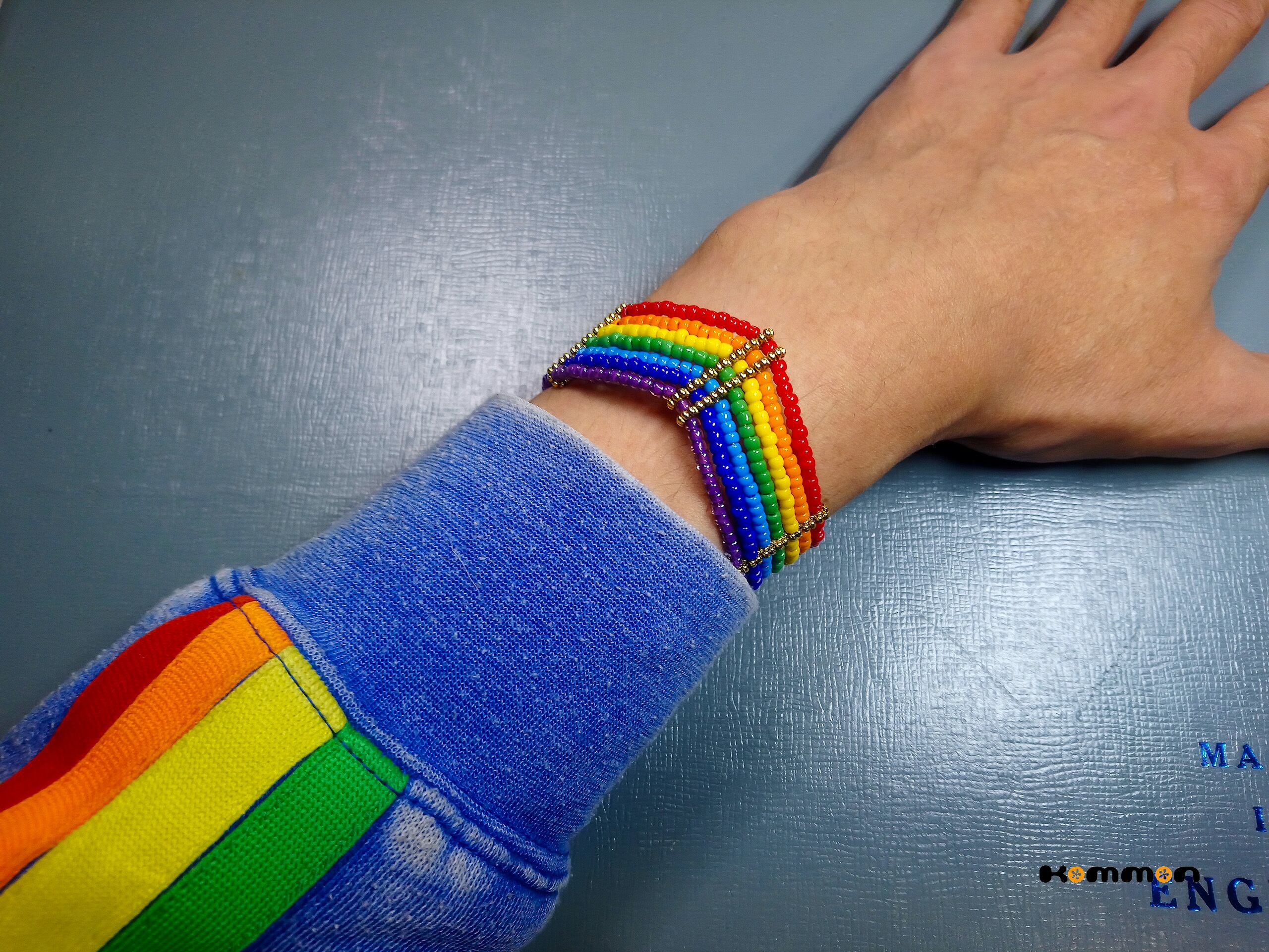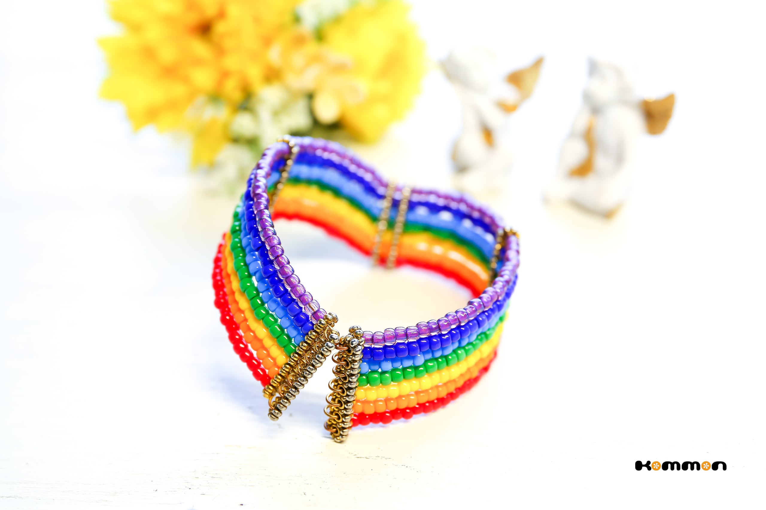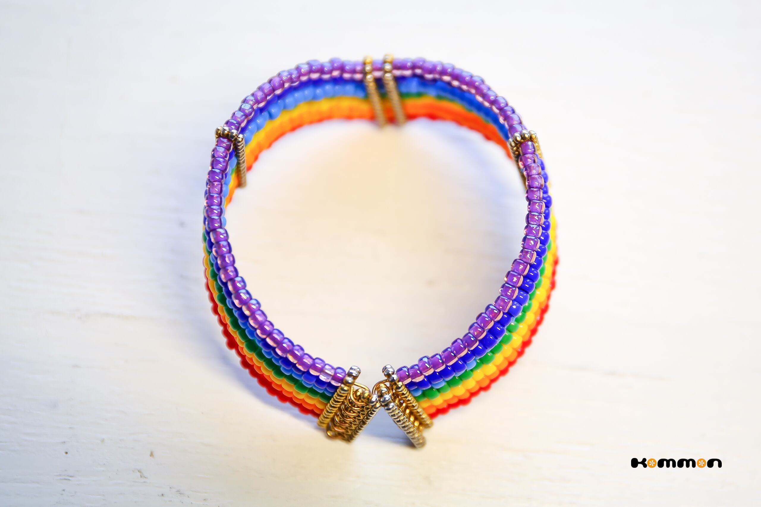 大好きな「虹」のモチーフを、7色のビーズで虹に見立ててバングルに仕立てました。