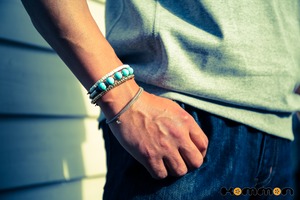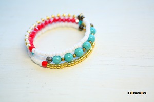 大粒ターコイズをメインに、ホワイト・ゴールド・レッドなどネイティブイメージのビーズたちを大胆にデザインしたうでわです。