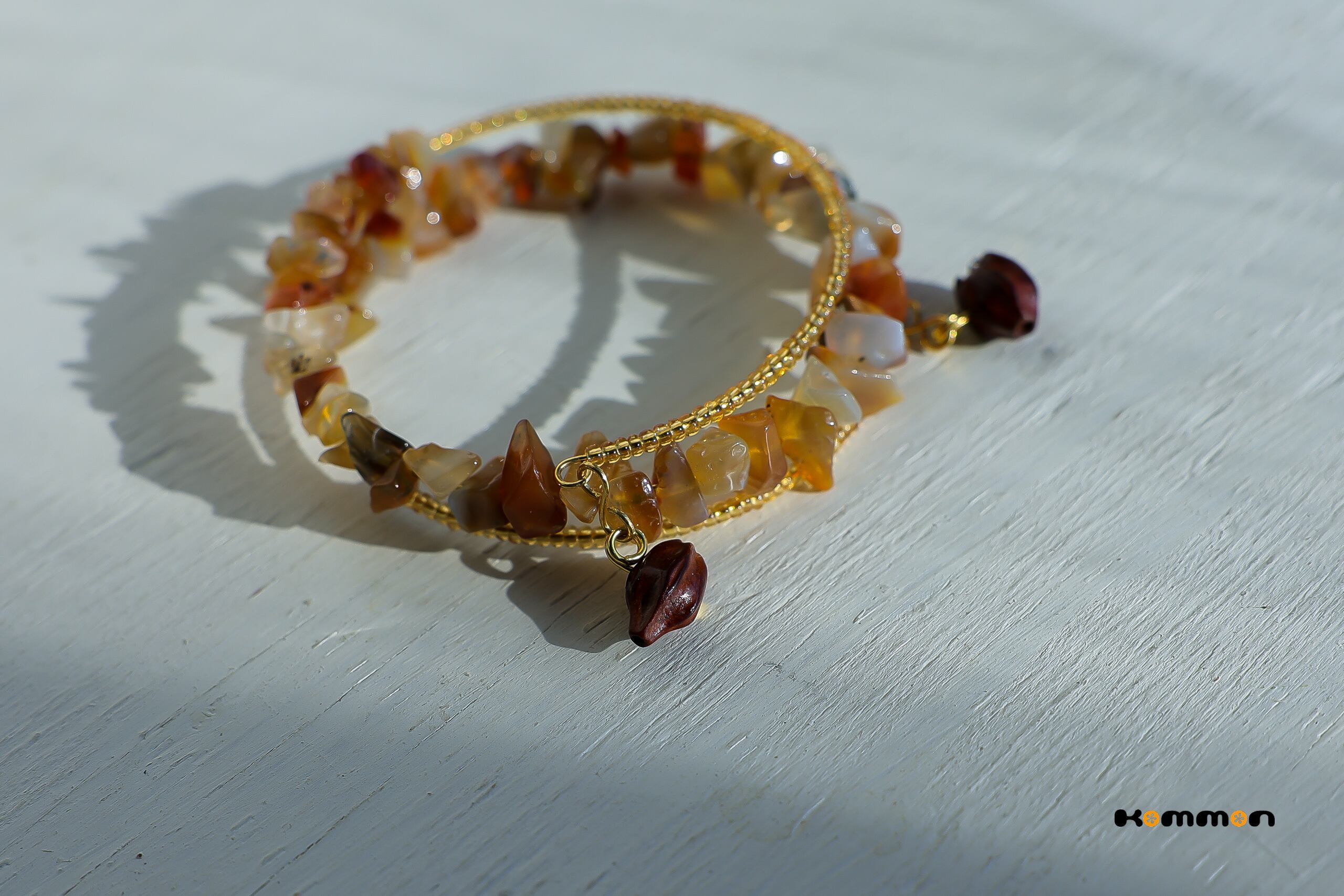 琥珀色の瑪瑙に組み合わせたのはゴールドに輝くシードビーズ。