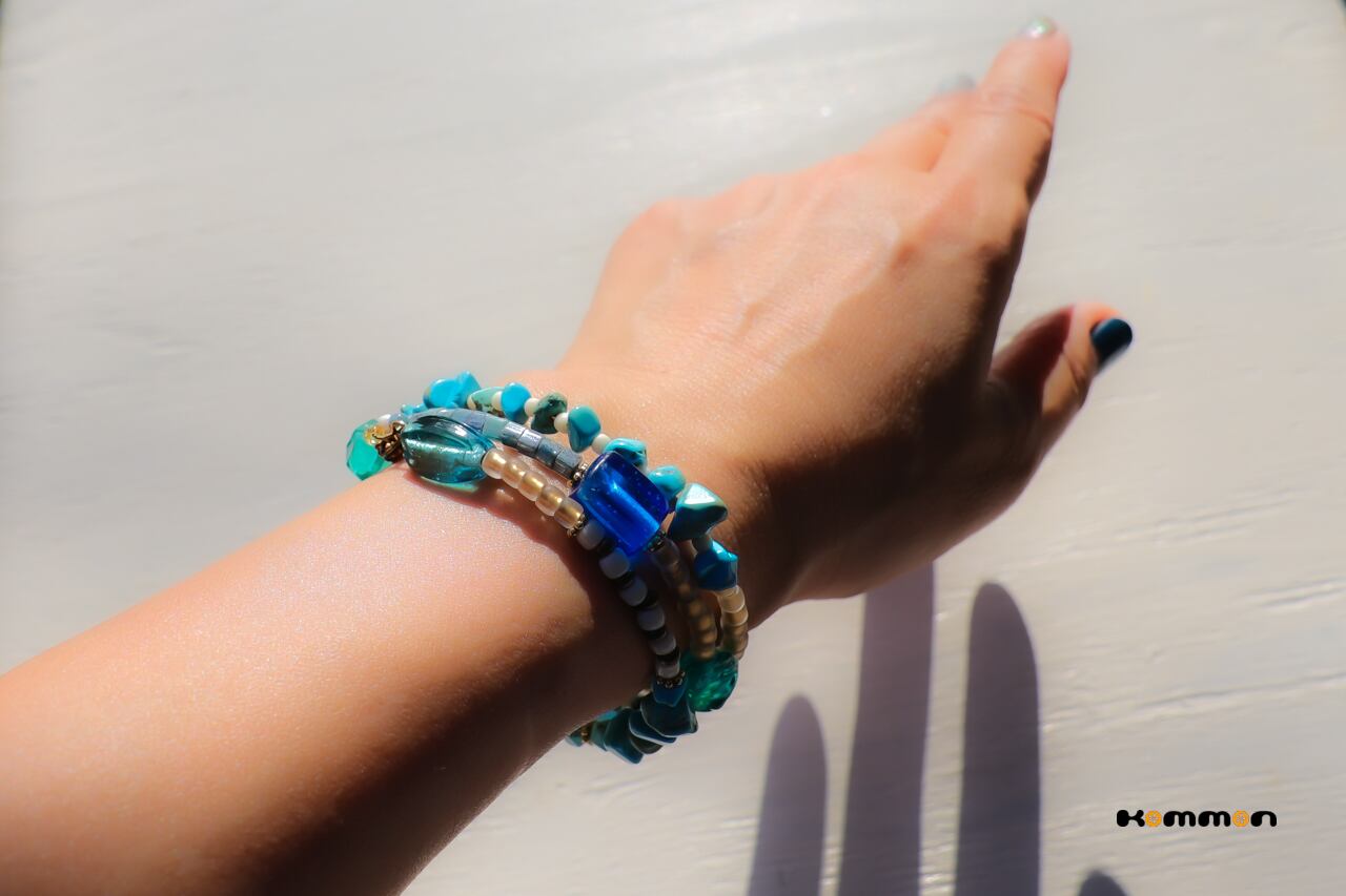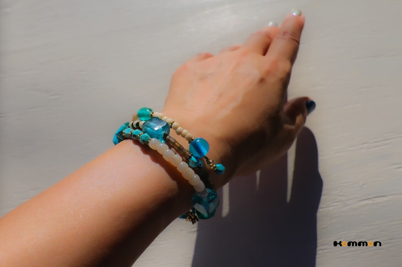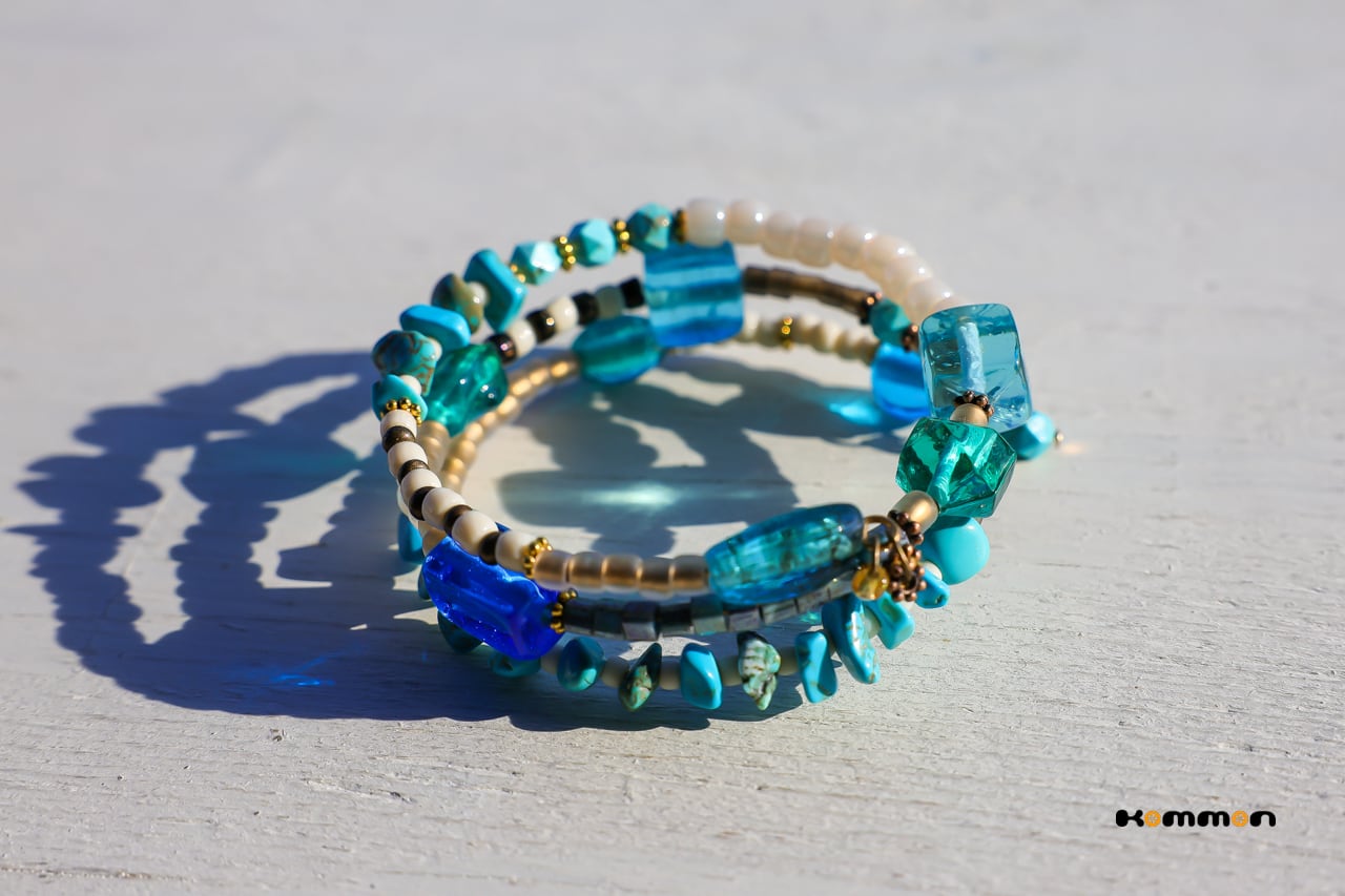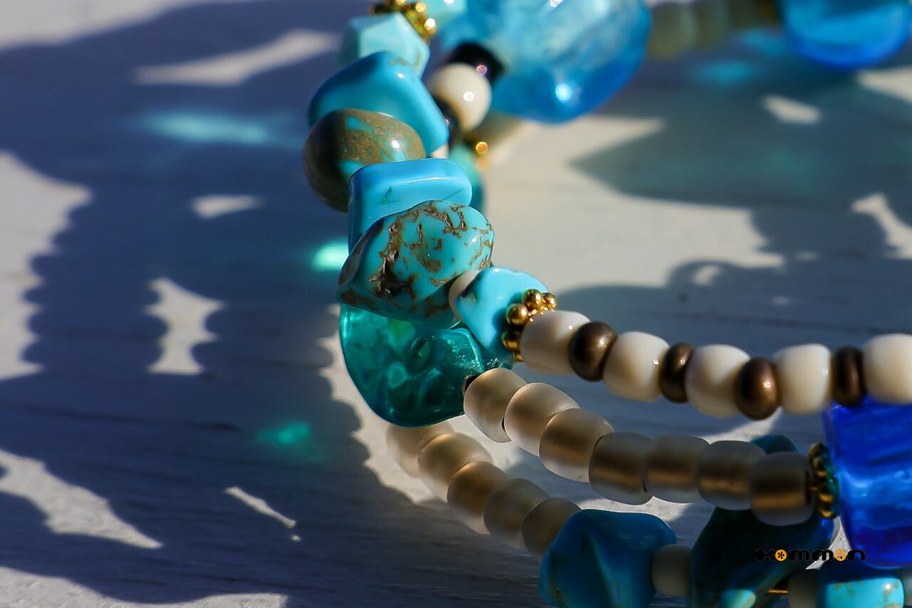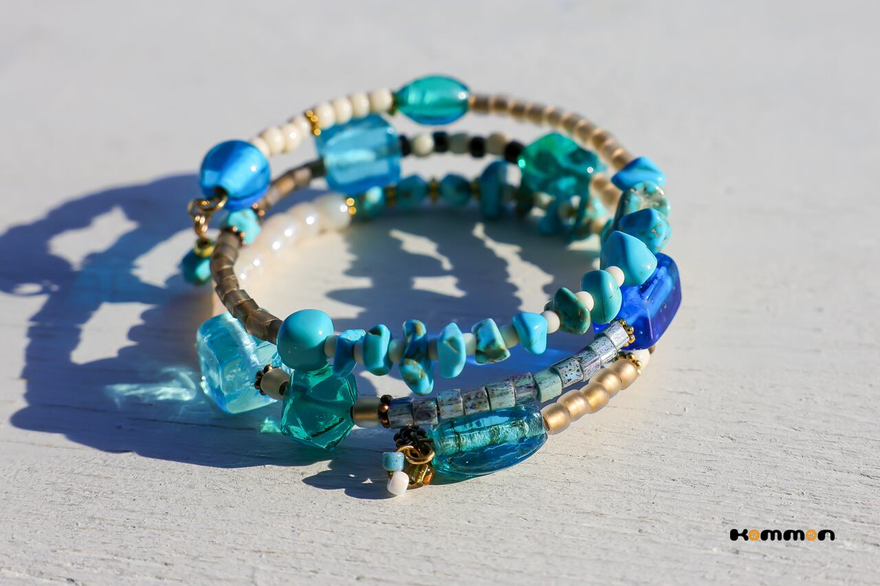 こちらは、夏らしいブルーが基調の大粒ビーズに、ターコイズのサザレ石や日本製高級シードグラスビーズなどを組み合わせてデザインしました。