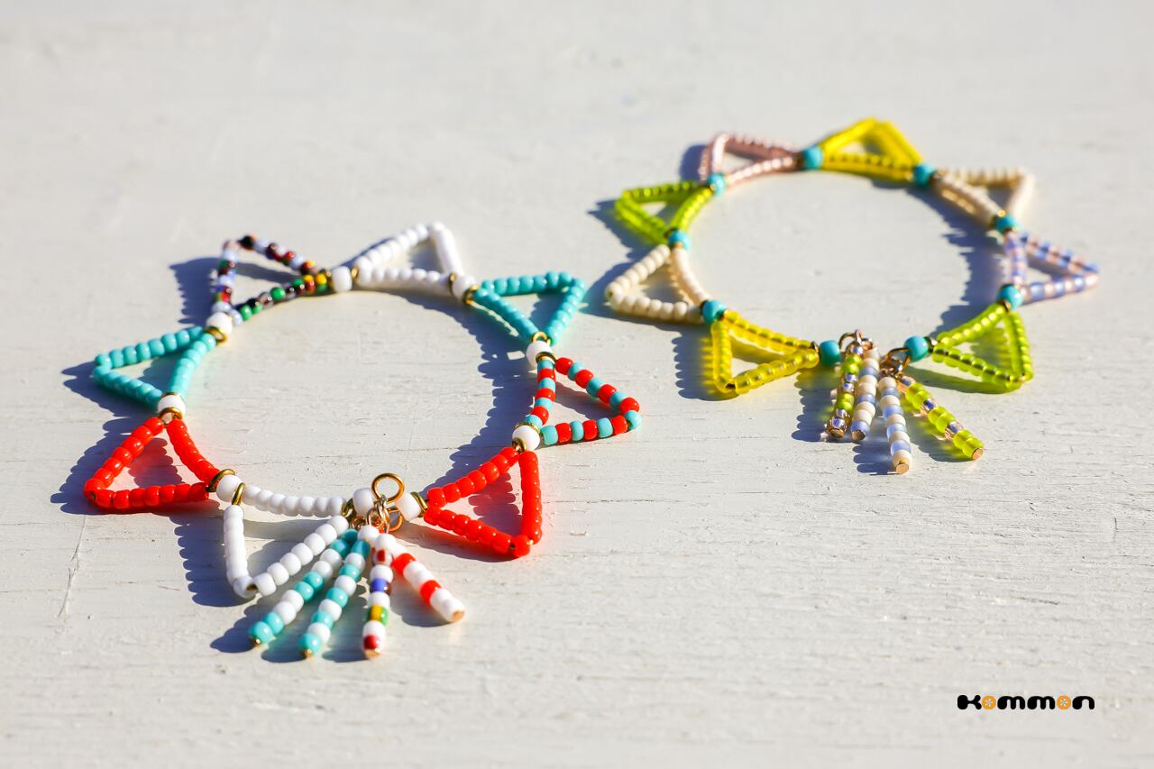 ガーランドうでわは、可愛らしく連なる三角の旗をイメージして、ワイヤーワークで日本製高級シードビーズの発色を活かしたデザインでうでわに仕立てました。
