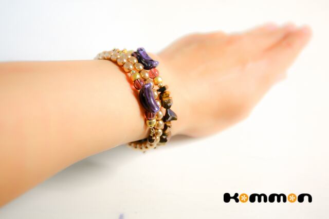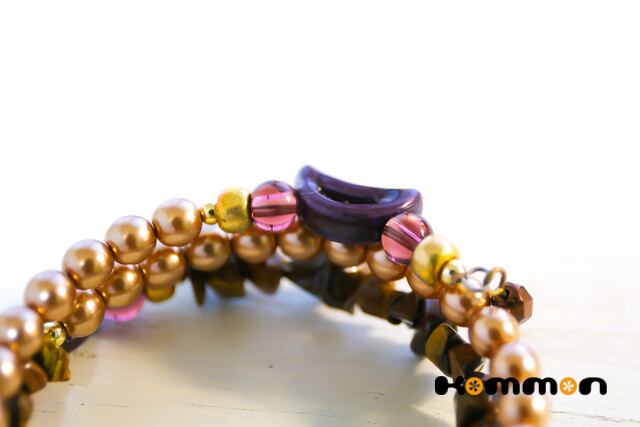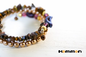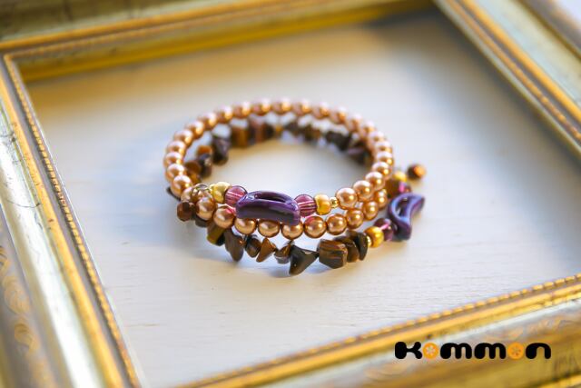 素材■パールガラスビーズ、天然石タイガーアイ、陶器製ビーズ、国産ビーズ(本金メッキ)、天然石アメジスト、ステンレス製メモリーワイヤー、メタルビーズ