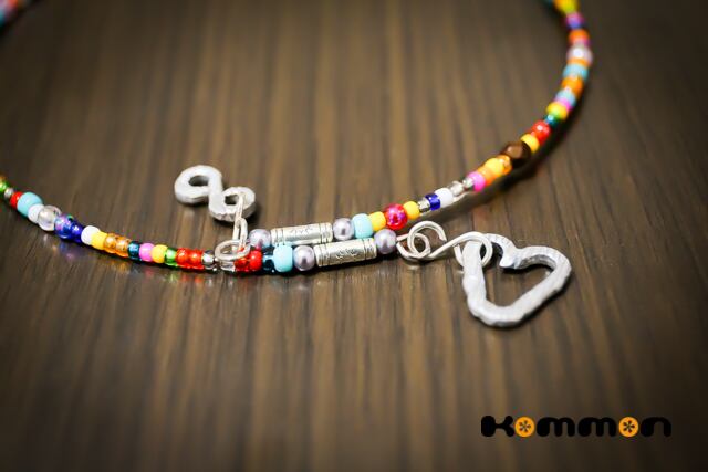 エンド部分にはハンドメイド・チャームを取り付けました。シルバーに見えますが、アルミ製なのでとっても軽く、着け心地ばつぐん。