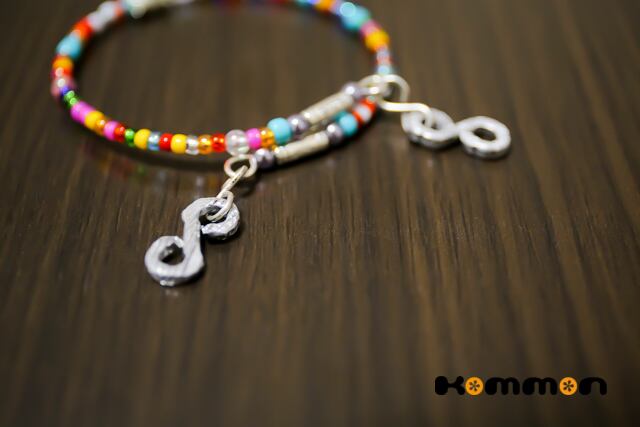 Kommonならではのビーズ&ワイヤーワークで制作されたブレスレットは、金属のチェーンに比べて鮮やかな色で手元を彩ります。