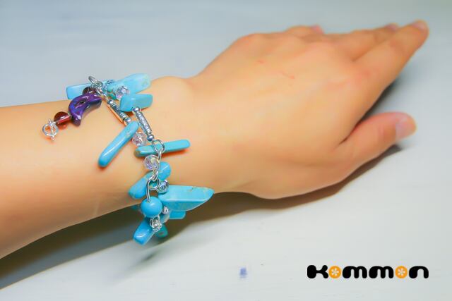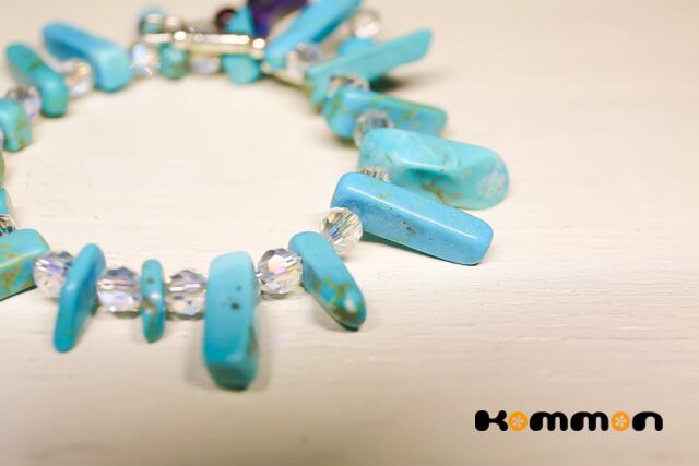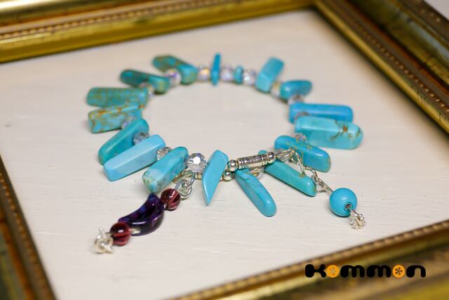 素材■ターコイズ、ガラスビーズ、メタルビーズ、チャーム、ステンレス製メモリーワイヤー