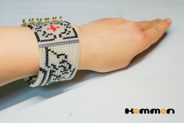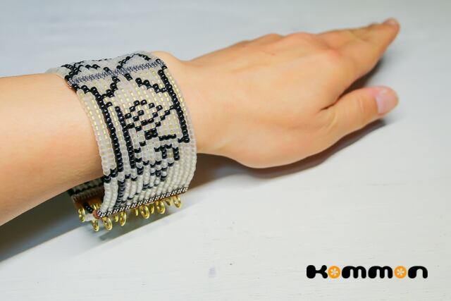 Kommonの制作者は北海道出身で、ゆかりのあるアイヌ文様をモチーフに、Kommon式ワイヤーワークを用いてうでわを制作しました。